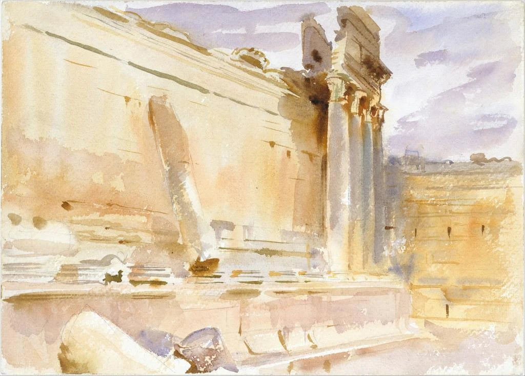 John Singer Sargent, peintre américain d'origine italienne, est célèbre pour ses portraits raffinés et ses paysages évocateurs. Actif à la fin du XIXe et au début du XXe siècle, il a été influencé par le mouvement impressionniste tout en développant son propre style distinctif. "Temple de Bacchus à Baalbek" témoigne de son intérêt pour l'architecture et les voyages, reflétant son admiration pour les civilisations anciennes. Sargent a su capturer l'esprit des lieux qu'il a visités, et cette œuvre en est un parfait exemple, illustrant son habileté à fusionner le réalisme avec une touche d'émotion.