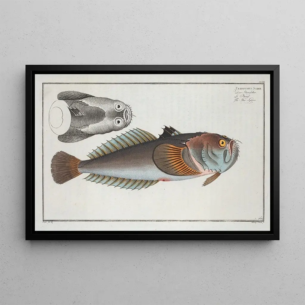 En esta ilustración, Marcus Elieser Bloch nos presenta el Uranoscopus scaber, un pez-gasista cuya forma única y colores vibrantes cautivan la mirada. La precisión del dibujo destaca los detalles anatómicos de este pez, revelando sus características distintivas, como sus ojos prominentes y su boca en una posición inusual. La atmósfera de la obra evoca tanto la belleza como la extrañeza del mundo marino, invitando al espectador a explorar los misterios de las profundidades oceánicas. Cada trazo refleja la experiencia del artista en la observación de la naturaleza.