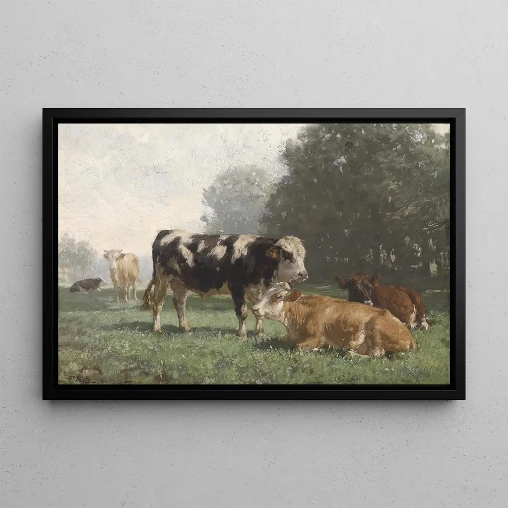 "Vacas descansando en el prado" es una obra que captura la tranquilidad de la vida rural. Friedrich Voltz, a través de esta impresión artística, nos transporta a un paisaje pastoral donde las vacas pastan tranquilamente bajo un cielo luminoso. Las tonalidades de verde y azul se mezclan armoniosamente, evocando la frescura de los prados. La técnica de Voltz, caracterizada por pinceladas delicadas, da vida a esta escena bucólica, creando una atmósfera de calma y serenidad. Esta impresión artística del cuadro "Vacas descansando en el prado" es una oda a la naturaleza y a la sencillez de la vida en el campo.