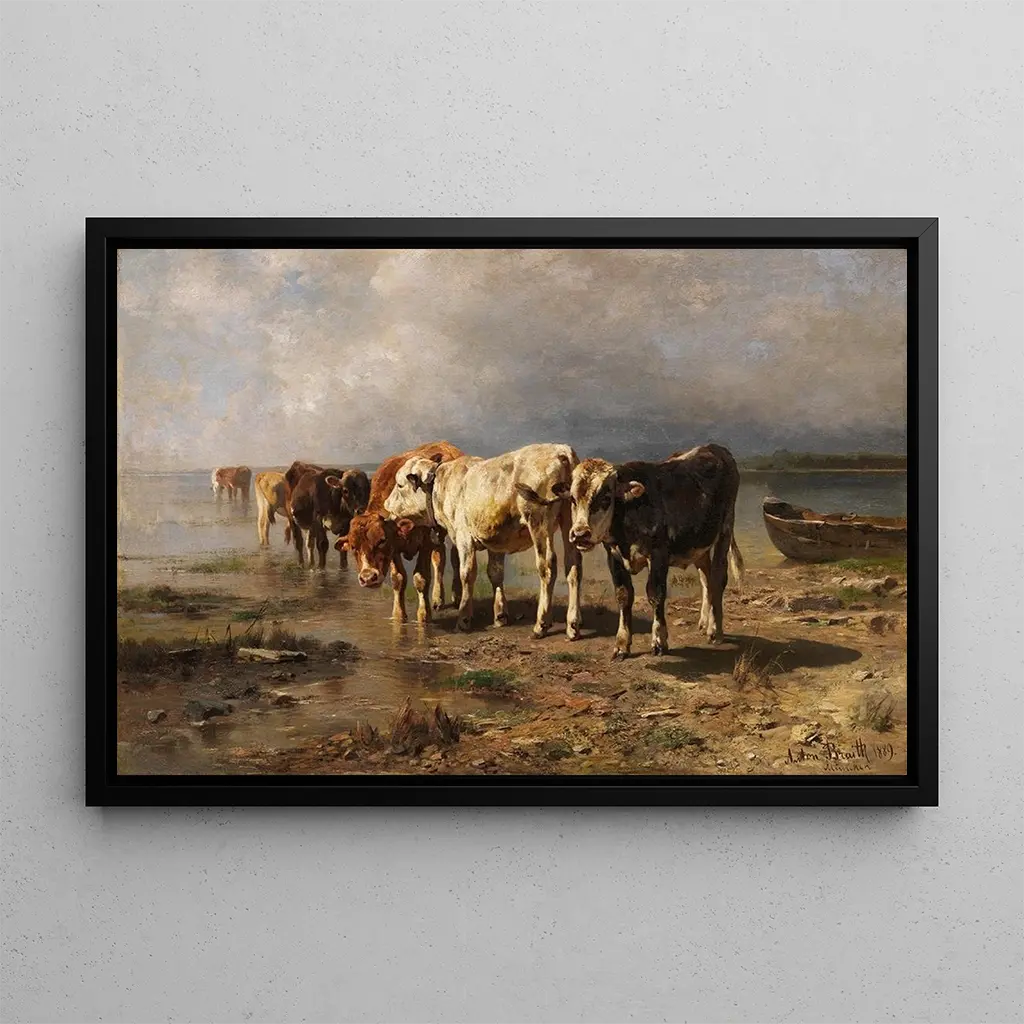 La reproduction Vaches au bord du lac d'Anton Braith évoque une tranquillité rurale, où la nature et l'animal se rencontrent dans une harmonie parfaite. Cette toile, réalisée avec des coups de pinceau délicats, met en avant des teintes douces et apaisantes qui rappellent les paysages verdoyants de la campagne. Les vaches, paisiblement installées près de l'eau, semblent profiter d'un moment de calme, créant une atmosphère de sérénité et de contemplation. L'œuvre invite à une évasion vers des espaces naturels, loin de l'agitation urbaine, et célèbre la beauté simple de la vie à la campagne.