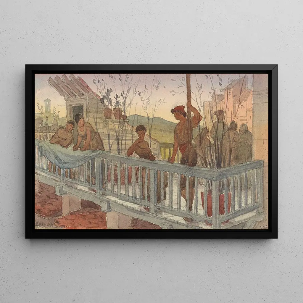 La impresión artística "Soirée" de Horatio Walter Lonsdale evoca una escena nocturna impregnada de dulzura y melancolía. Los colores cálidos y las tonalidades de azul crean un ambiente relajante, mientras que las siluetas de los personajes se dibujan delicadamente en la luz tenue. La técnica de Lonsdale, que combina hábilmente el realismo y el impresionismo, permite capturar la esencia de un momento suspendido en el tiempo. Cada detalle, desde los reflejos en el agua hasta las sombras de los árboles, contribuye a una atmósfera de tranquilidad, invitando al espectador a sumergirse en esta escena íntima.