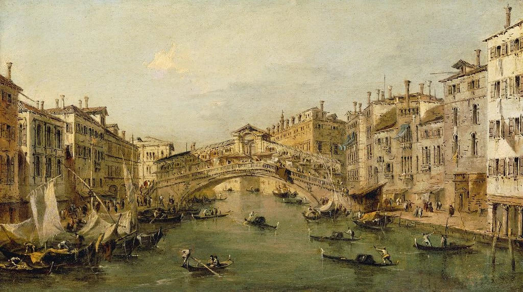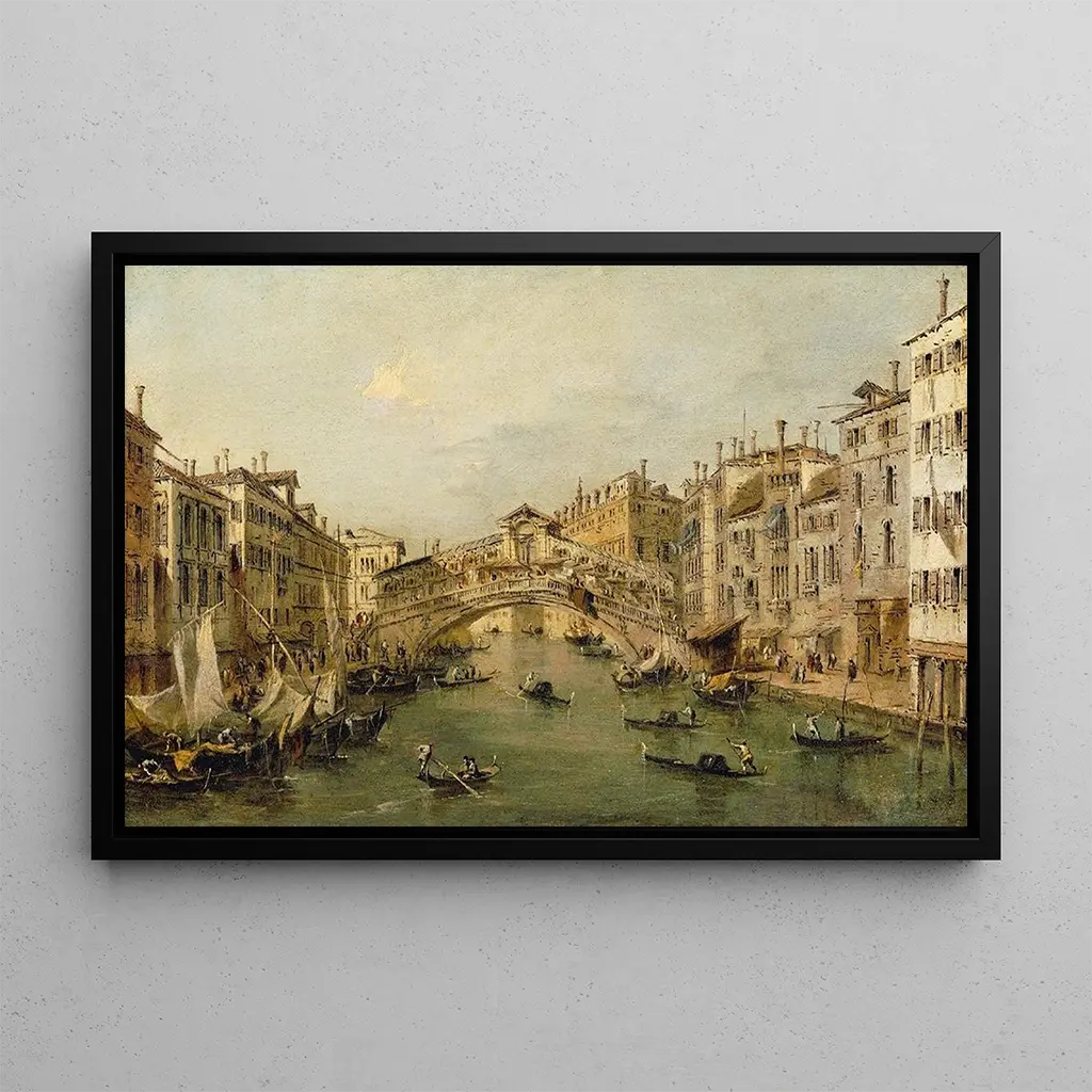 En "Venecia, el Rialto", Francesco Guardi captura la esencia misma de la Serenísima con una delicadeza poética. Las góndolas se deslizan tranquilamente sobre las aguas brillantes, mientras que los edificios históricos se reflejan en el canal. Los colores cálidos y dorados evocan la luz del sol veneciano, creando una atmósfera a la vez viva y nostálgica. La técnica de Guardi, que combina toques impresionistas y detalles realistas, permite a los espectadores sentir el alma vibrante de Venecia, como si pudieran escuchar el murmullo de las aguas y el canto de los gondoleros.