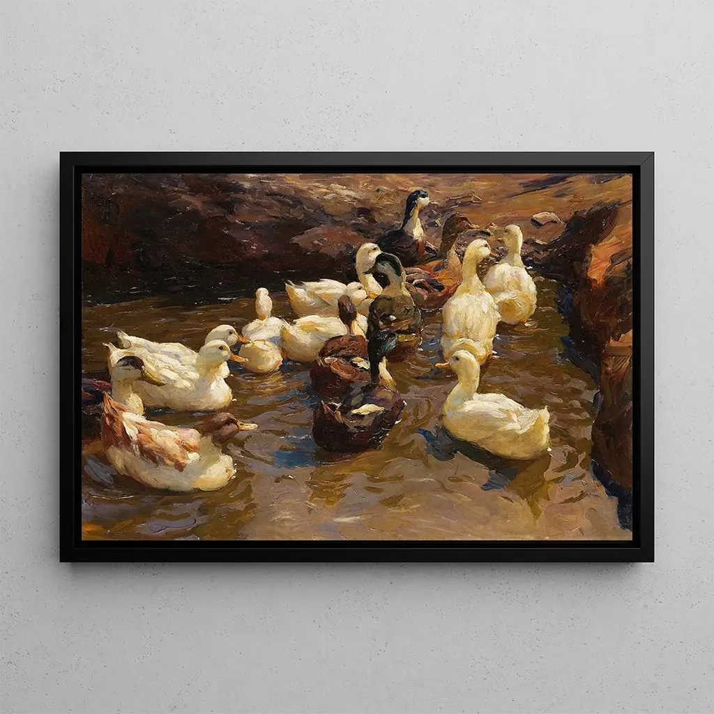 Vers la rive : une ode à la nature sauvage La reproduction de Vers la rive transporte le spectateur au cœur d'une scène bucolique où la nature s'épanouit dans toute sa splendeur. Ce tableau, réalisé par Alexander Koester, capture avec finesse la tranquillité d'un cours d'eau bordé de végétation luxuriante. Les nuances de vert et de bleu se mêlent harmonieusement, créant une atmosphère apaisante et contemplative. La technique de Koester, qui combine réalisme et impressionnisme, permet de ressentir le mouvement de l'eau et le souffle du vent dans les feuillages, invitant à une évasion sensorielle au sein de ce paysage idyllique. Alexander Koester : un virtuose de la peinture animalière et paysagère Alexander Koester, peintre allemand du début du XXe siècle, est célèbre pour ses œuvres qui mettent en avant la beauté de la faune et de la flore. Influencé par les courants naturalistes et impressionnistes, il excelle dans la représentation de scènes de la vie sauvage, où les animaux évoluent dans des paysages enchanteurs. Sa carrière, marquée par une attention particulière aux détails et une palette de couleurs vibrantes, lui a permis de se faire un nom dans le monde de l'art. Koester a su capturer l'harmonie entre l'homme et la nature, faisant de ses œuvres un reflet de l'époque où l'art se tourne vers la célébration de la beauté naturelle. Une acquisition décorative aux multiples atouts La reproduction de Vers la rive constitue un choix décoratif idéal pour embellir votre intérieur, que ce soit dans un salon, un bureau ou une chambre. Sa qualité de reproduction assure une fidélité exceptionnelle aux couleurs et aux détails de l'œuvre originale, apportant une touche de sérénité à votre espace. En intégrant cette toile à votre décoration, vous créez une ambiance apaisante et inspirante, tout en rendant hommage à la beauté de la nature. Ce tableau est bien plus qu'un simple élément décoratif ; il évoque une connexion profonde avec le monde naturel, enrichissant ainsi votre environnement quotidien.