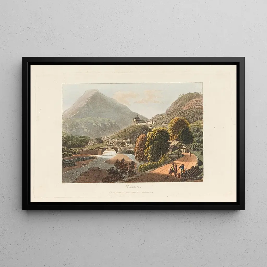 Frederic Schoberl, activo a principios del siglo XIX, es reconocido por sus representaciones de paisajes y arquitecturas. Influenciado por el movimiento romántico, supo capturar la belleza de los lugares con una sensibilidad particular. Sus obras reflejan una admiración por la naturaleza y una búsqueda de serenidad, características de su época. Schoberl también contribuyó a la difusión del arte a través de sus ilustraciones y grabados, haciendo sus paisajes accesibles a un amplio público. La villa es un ejemplo perfecto de su talento, ilustrando su habilidad para crear composiciones equilibradas y poéticas.