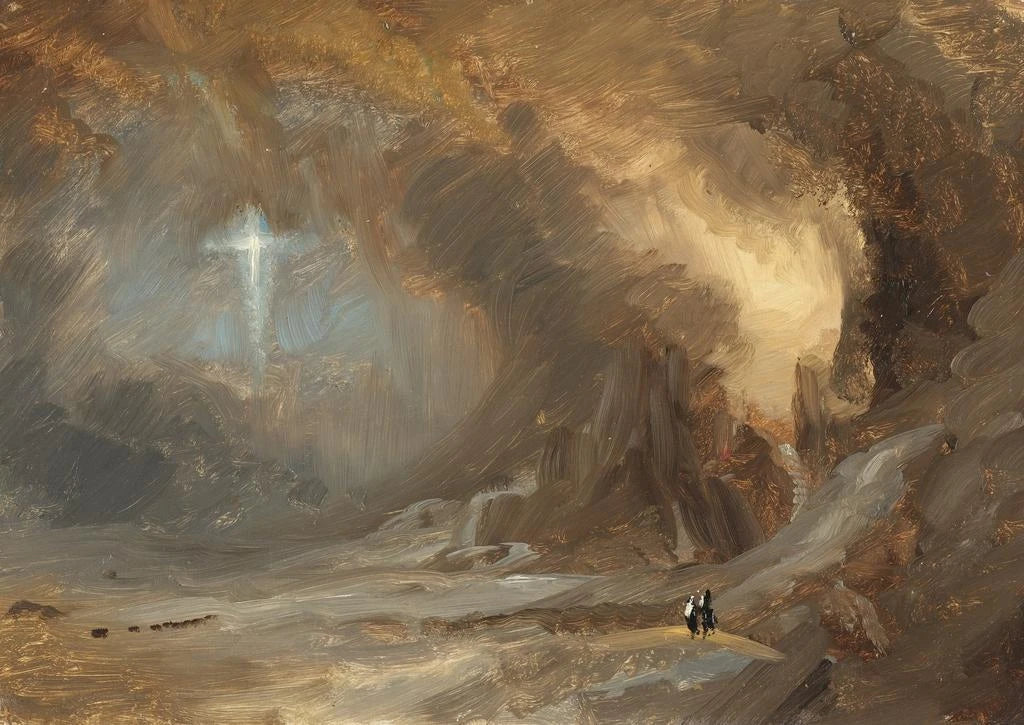 "Visión de la Cruz" de Frederic Edwin Church es una obra cautivadora que evoca una experiencia mística. La tela, bañada en una luz dorada, representa una escena donde la cruz se erige majestuosamente en la cima de una montaña, rodeada de nubes y paisajes grandiosos. Los colores vibrantes, que van desde naranjas brillantes hasta azules profundos, crean una atmósfera a la vez dramática y tranquilizadora. La técnica de Church, caracterizada por un realismo minucioso y una atención especial a los detalles, permite sentir la potencia espiritual de esta visión.