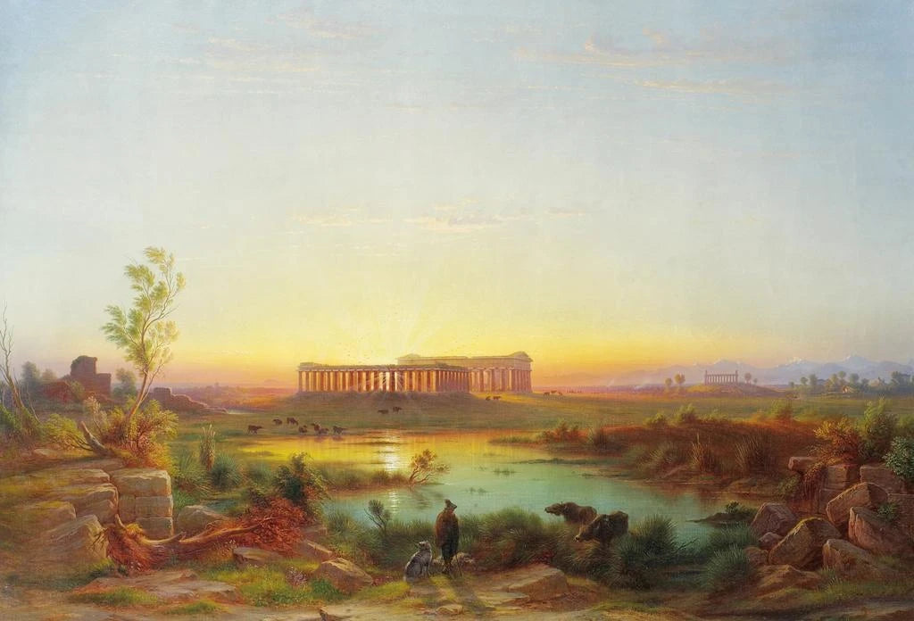 Johann Rudolf Buhlmann, pintor suizo del siglo XIX, es reconocido por sus paisajes y sus escenas históricas. Su obra está marcada por una fascinación por la Antigüedad, que explora a través de viajes en Italia. Influenciado por el neoclasicismo, Buhlmann busca capturar el espíritu de los lugares que visita, destacando la belleza de las ruinas y su significado histórico. Sus obras, entre ellas la famosa Vue de Paestum, testimonian una época en la que la Antigüedad era redescubierta y celebrada, reflejando las aspiraciones artísticas de su tiempo.
