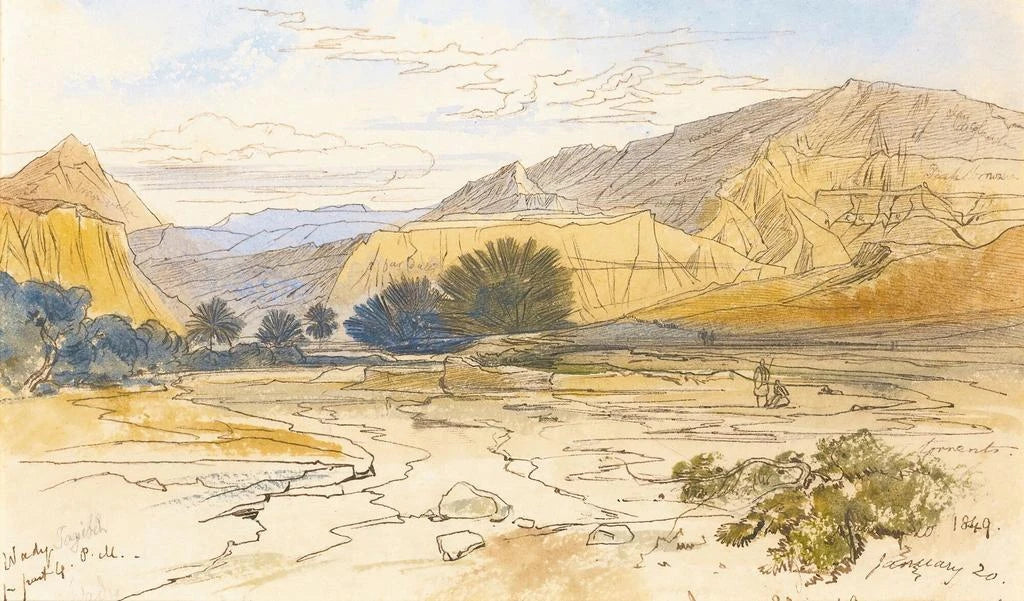 Edward Lear es a menudo considerado como uno de los precursores del paisaje romántico, habiendo viajado por Europa y Oriente Medio para capturar la belleza de los lugares que visitaba. Su técnica de pintura con acuarela, combinada con un agudo sentido de la observación, le permitió crear obras que son a la vez realistas y poéticas. Lear fue influenciado por los paisajes que descubrió, y "Wadi Tayibeh" es un ejemplo perfecto, reflejando su amor por la naturaleza y su deseo de compartir su visión del mundo. Su trabajo continúa inspirando a artistas y amantes del arte a lo largo del tiempo.