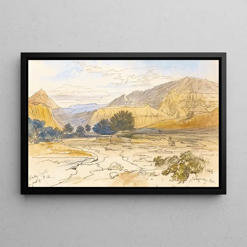 La impresión artística de "Wadi Tayibeh, Egipto" revela un paisaje cautivador, donde los tonos cálidos del desierto se mezclan con la frescura de los valles verdes. Edward Lear, con su estilo distintivo, captura la belleza salvaje de esta región, evocando una atmósfera de tranquilidad y escapismo. Los detalles minuciosos de las rocas y la suavidad de los cielos crean una composición armoniosa, invitando al espectador a explorar cada rincón de este cuadro. Esta obra es una verdadera oda a la naturaleza, celebrando la esplendor de los paisajes egipcios a través de pinceladas delicadas.