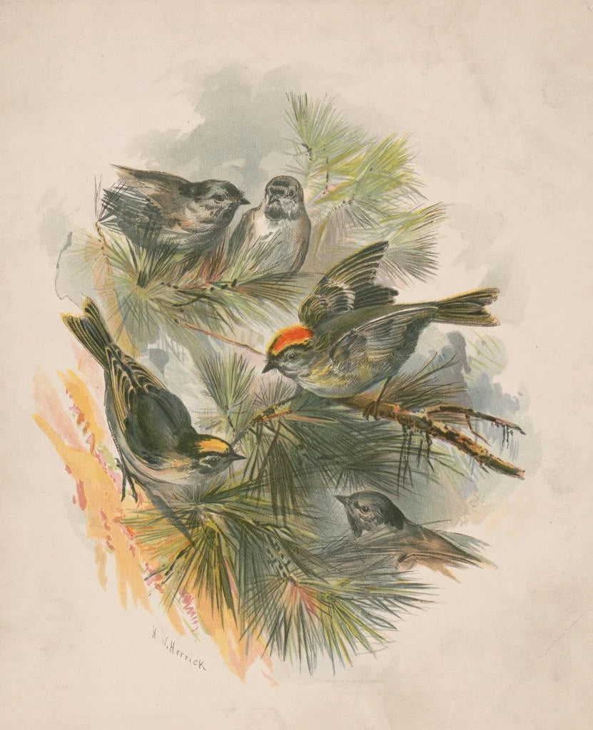 Pájaros sobre ramas de pino - Henry Walker Herrick