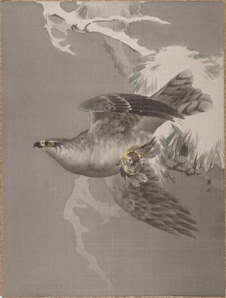 Halcón sosteniendo un pequeño pájaro - Okada Baison