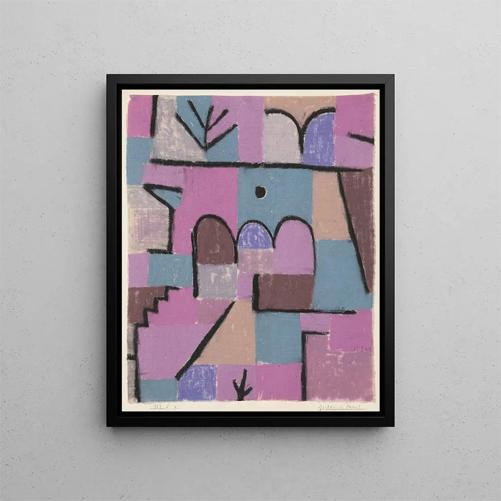 Reproducción artística de la obra Jardín en Oriente del artista Paul Klee. Esta impresión en lienzo o papel captura la esencia vibrante y la sensibilidad poética de la obra original, perfecta para decorar su hogar u oficina con un toque de creatividad y elegancia.