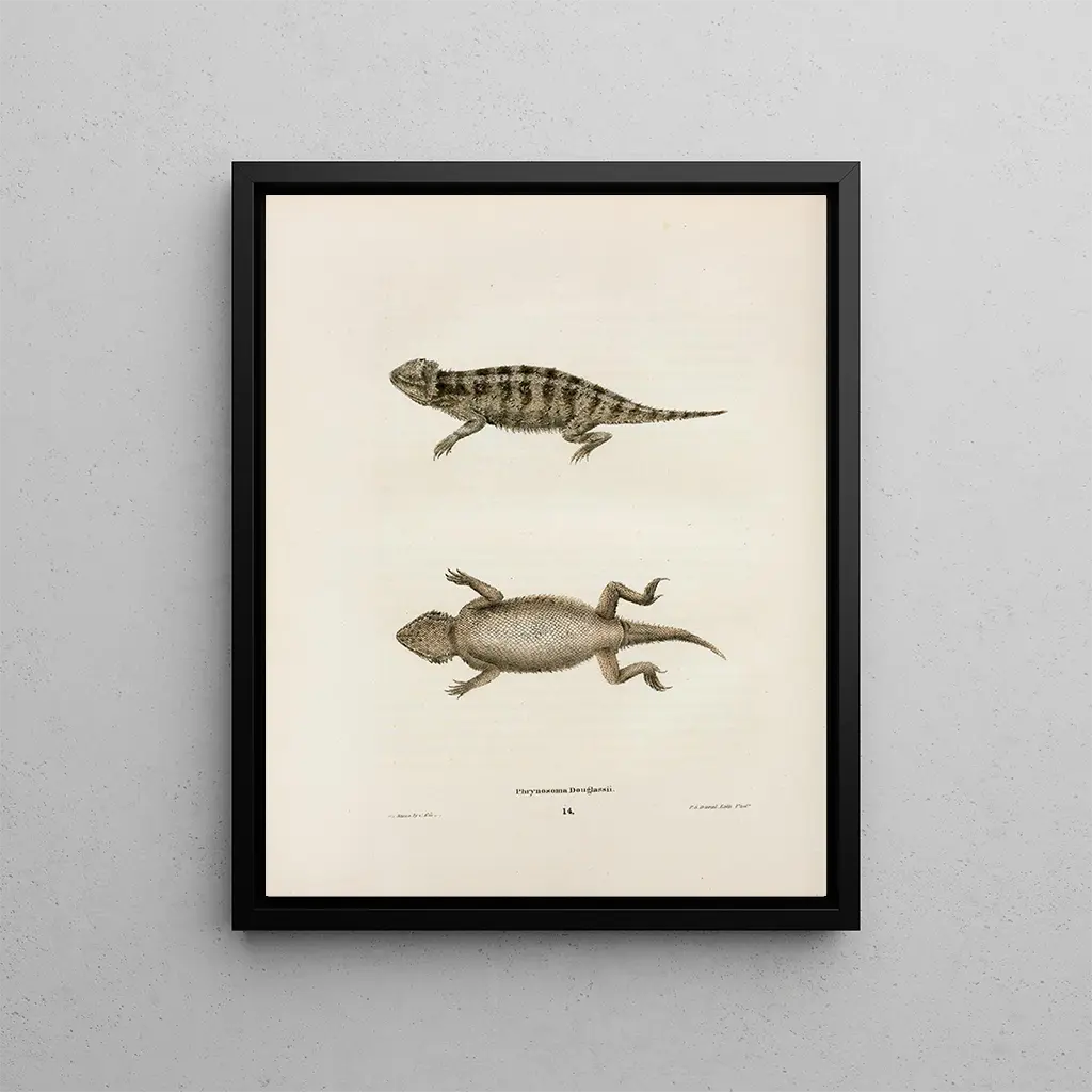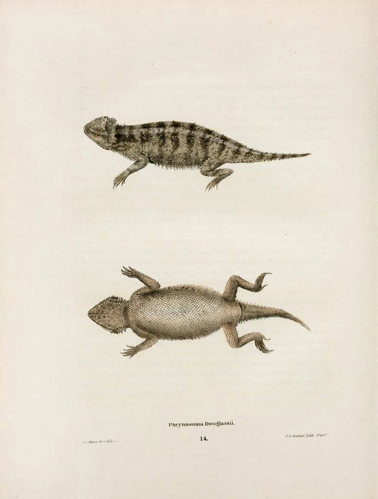 Reproducción artística de Phrynosoma douglassii por John Edwards Holbrook. Esta impresión de arte de alta calidad captura los detalles únicos de esta especie fascinante. Perfecta para decorar su hogar u oficina con un toque de naturaleza y ciencia.