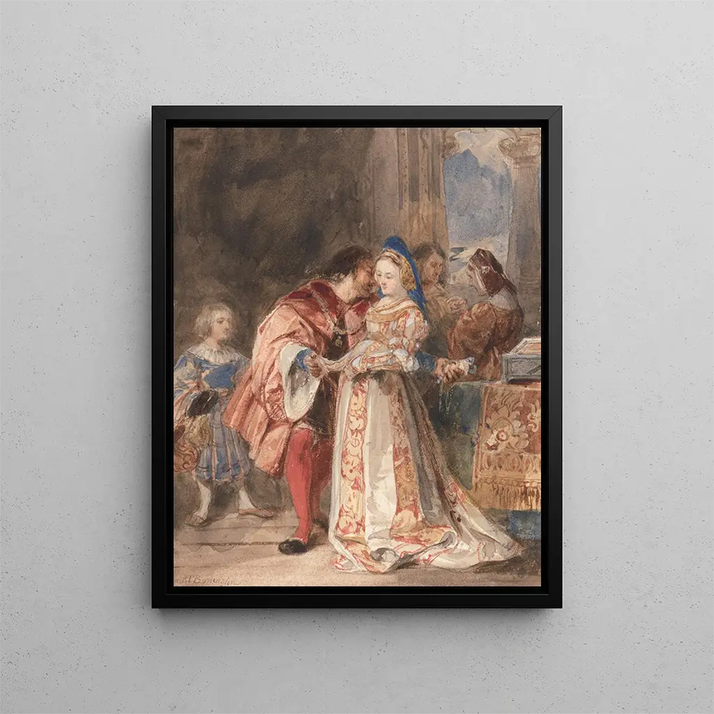 Reproducción artística de la famosa obra de Richard Parkes Bonington, que captura la escena clásica de Portia y Bassanio. Perfecta para decorar su hogar u oficina con un toque de elegancia y cultura.