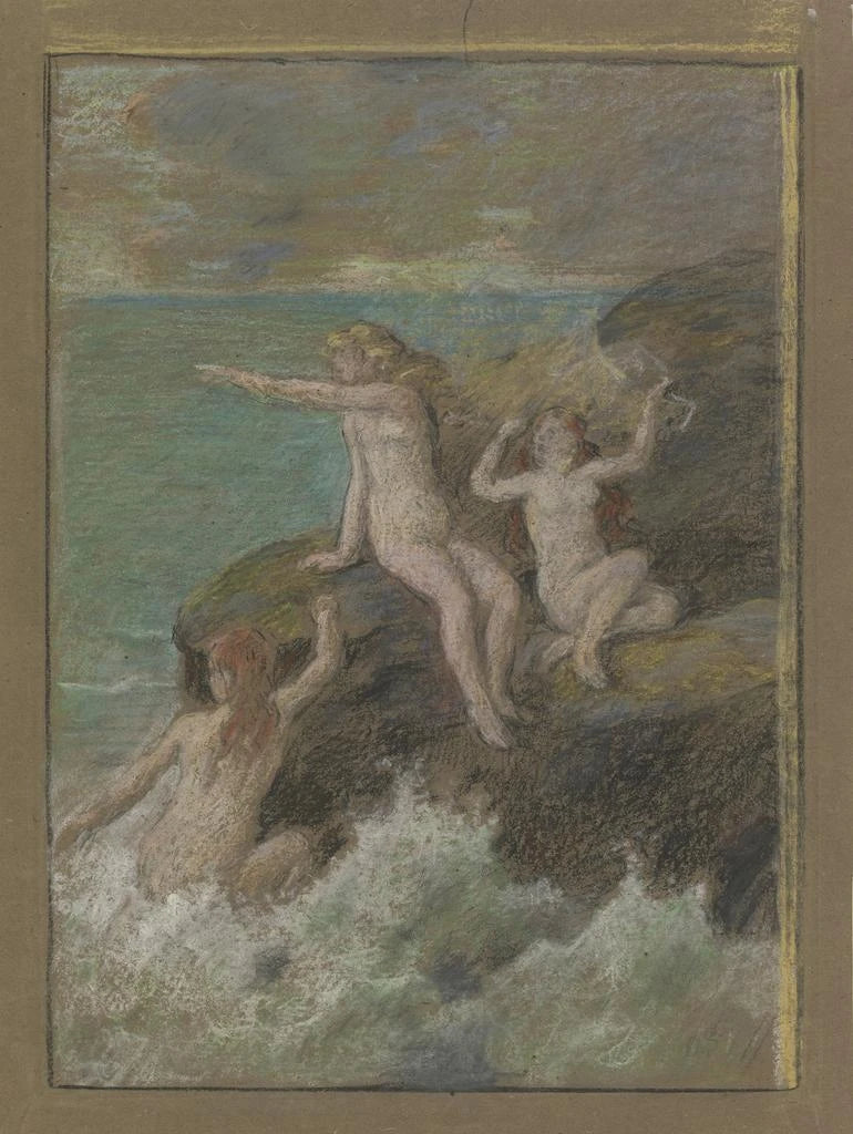 Tres mujeres desnudas sobre una roca - Otto Scholderer