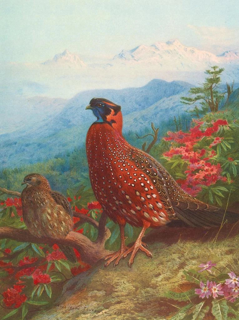 Archibald Thorburn, nacido en 1860, es considerado a menudo como uno de los más grandes artistas naturalistas de su tiempo. Su pasión por la naturaleza y su compromiso de representar la fauna con una precisión científica marcaron su obra. Influenciado por los paisajes escoceses y la biodiversidad que lo rodea, Thorburn supo combinar su amor por la naturaleza con un talento artístico indiscutible. Sus obras, entre ellas "Le Satyre tragopan", testimonian una época en la que la preservación de la naturaleza comenzaba a sentirse, y donde el arte podía desempeñar un papel en la sensibilización hacia esta causa. El legado de Thorburn perd