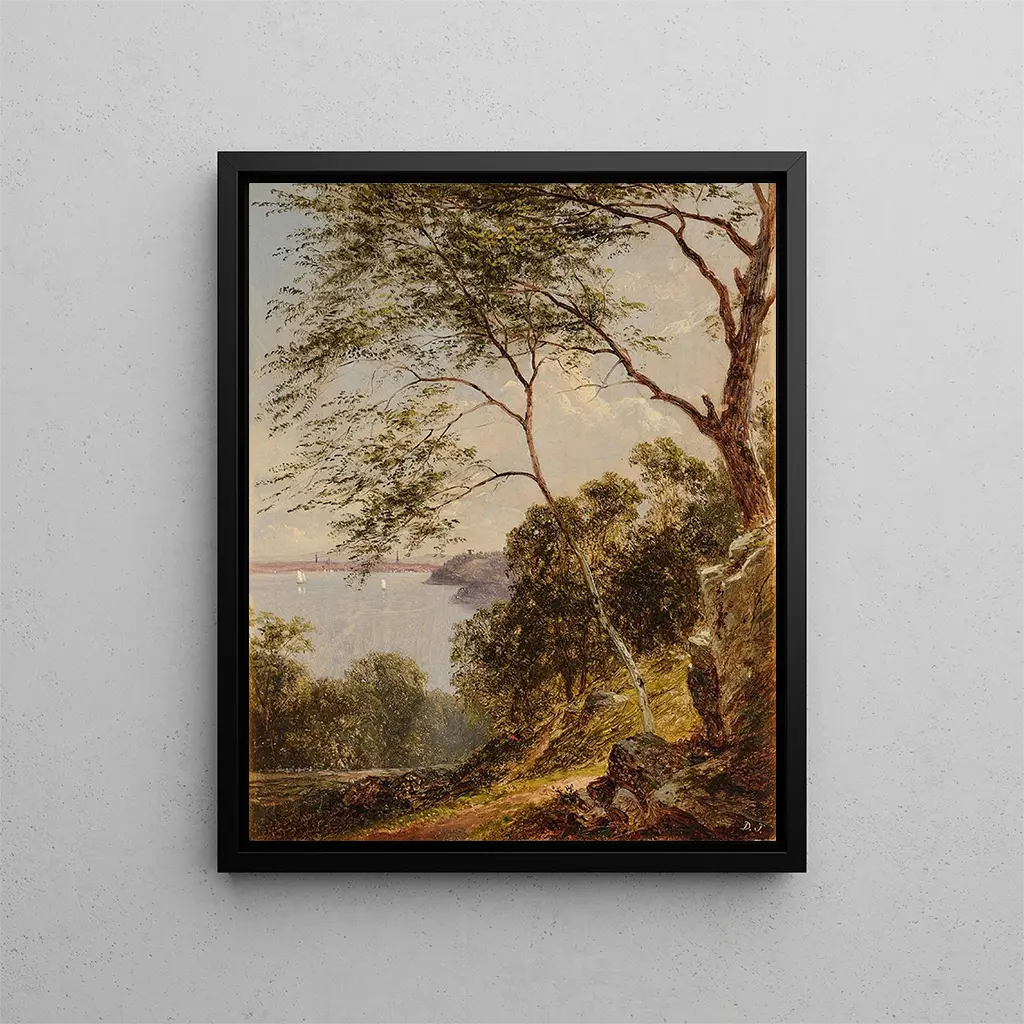 El estilo de David Johnson está profundamente enraizado en el movimiento de la escuela del río Hudson, que promueve un enfoque romántico y realista del paisaje. En "Desde Union Hill Hoboken", Johnson utiliza una paleta de colores sutilmente matizada, donde los verdes exuberantes de los árboles se mezclan con los reflejos brillantes del agua. La composición de la obra es a la vez equilibrada y dinámica, con elementos naturales que parecen bailar bajo el efecto de la luz. Este cuadro no se limita a representar un paisaje; evoca una atmósfera, una emoción. Cada pincelada es una invitación a sentir la suavidad del viento, el susurro del agua y el calor del sol sobre la piel. Es esa capacidad de trascender lo visual para tocar el alma lo que confiere a esta obra una singularidad indiscutible.