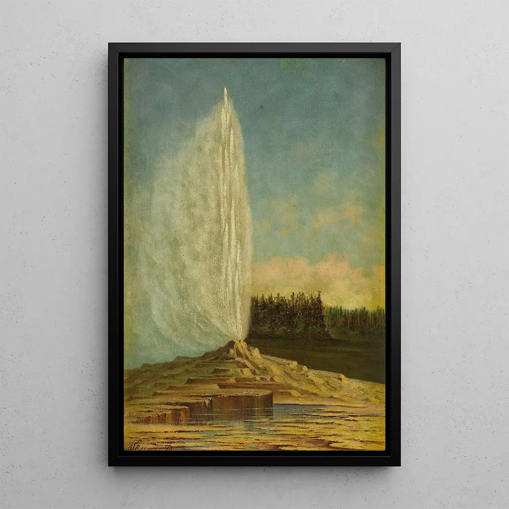 El cuadro "Geyser de Yellowstone" de Grafton Tyler Brown captura la esencia misma de la naturaleza salvaje americana. Con pinceladas dinámicas, el artista evoca la potencia de un géiser en erupción, proyectando chorros de agua y vapor en una danza colorida. Los tonos vibrantes de azul, de amarillo y de blanco se mezclan armoniosamente, creando una atmósfera a la vez enérgica y serena. La composición, centrada en el géiser, atrae inmediatamente la mirada, mientras que el paisaje circundante, rico en detalles, invita a la exploración. Esta impresión artística es una verdadera oda a la belleza natural y a la majestuosidad de los parques nacionales americanos.