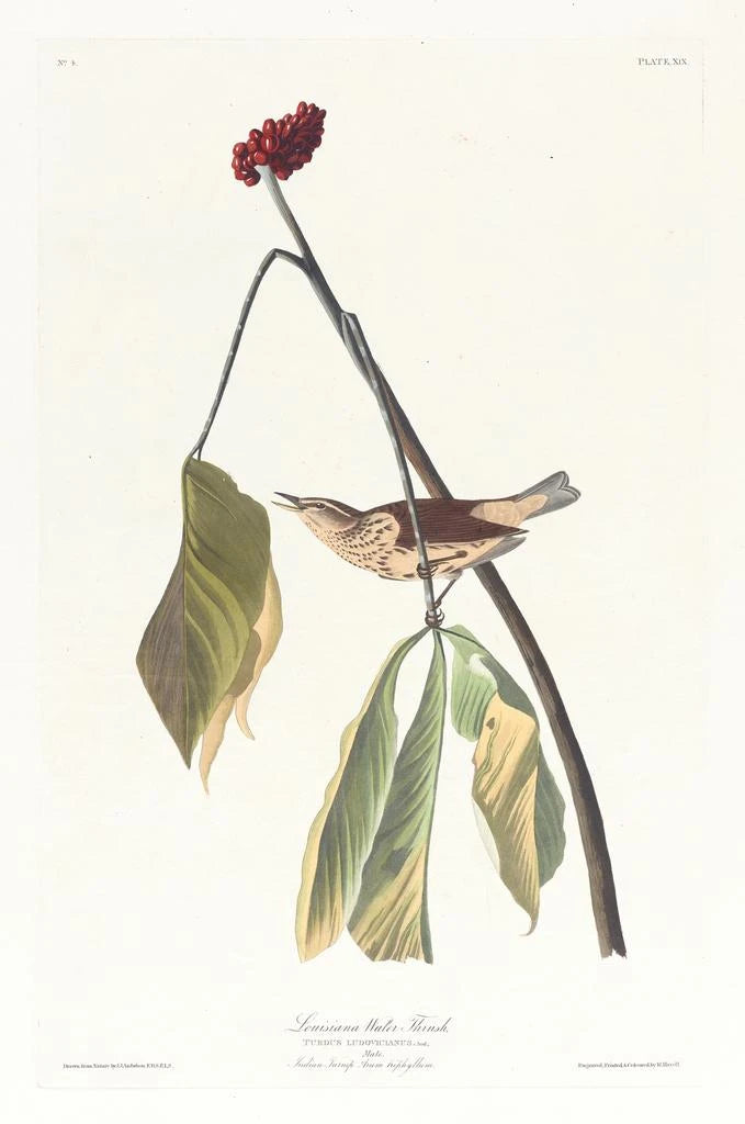 John James Audubon, naturalista y artista del siglo XIX, es reconocido como uno de los pioneros de la ornitología. Nacido en Haití en 1785, emigró a Estados Unidos donde desarrolló una pasión por las aves y su hábitat. Sus obras, incluida la impresión artística de la Grive de Louisiane, testimonian una observación minuciosa y un profundo respeto por la naturaleza. Audubon supo combinar arte y ciencia, creando ilustraciones que se han convertido en referencias en el campo de la ornitología. Su trabajo no solo contribuyó al conocimiento de las especies aviares, sino que también influyó en muchos artistas y naturalistas de su época, convirtiéndolo en una figura emblemática del movimiento romántico.