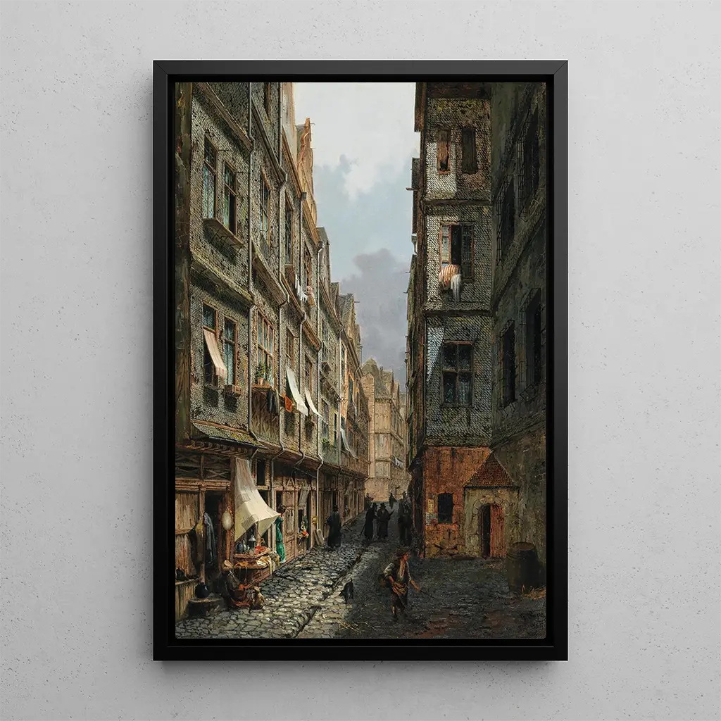 La Judengasse en Francfort-sur-le-Main : una inmersión en la historia urbana La impresión artística de La Judengasse en Francfort-sur-le-Main nos transporta al corazón de un barrio histórico, donde las callejuelas estrechas y los edificios antiguos cuentan siglos de vida. Gereon Pape, con su dominio de los colores y los detalles, logra capturar la atmósfera única de este lugar. Los tonos cálidos de las fachadas se mezclan con la luz suave del día, creando un ambiente a la vez nostálgico y vibrante. La técnica de pintura al óleo permite representar cada ladrillo, cada sombra, con una precisión que invita a la contemplación. Este cuadro, verdadera ventana al pasado, evoca una historia rica y compleja. Gereon Pape: un testigo de la modernidad alemana Gereon Pape, artista alemán del siglo XX, es reconocido por sus obras que combinan realismo e impresionismo. Influenciado por los grandes maestros de la pintura, ha sabido desarrollar un estilo propio, marcado por una atención especial a los detalles arquitectónicos y a la luz. Activo durante un período de cambios en Europa, Pape ha buscado a menudo capturar la esencia de los lugares históricos, como lo demuestra esta obra. La Judengasse, símbolo de una comunidad judía próspera, es un tema que resuena con la historia alemana, y Pape, a través de su arte, contribuye a la memoria colectiva de esa época. Una adquisición decorativa con múltiples ventajas Optar por la impresión artística de La Judengasse en Francfort-sur-le-Main es elegir un cuadro que enriquecerá su interior, ya sea en una sala de estar, una oficina o un dormitorio. Su calidad de impresión y su fidelidad a la obra original la convierten en un elemento decorativo de elección, capaz de despertar curiosidad y admiración. El atractivo estético de esta obra reside en su capacidad para evocar emociones mientras aporta un toque de elegancia a su espacio. Al integrar esta impresión artística, ofrece a su decoración un acento histórico y cultural, creando a la vez una atmósfera cálida y acogedora.