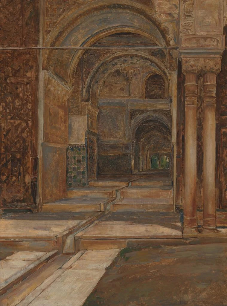 Émile Vloors, artista belga del siglo XIX, es frecuentemente reconocido por su capacidad para capturar la esencia de los lugares que representa. Influenciado por las corrientes artísticas de su tiempo, desarrolla un estilo que combina tradición e innovación. Su fascinación por la arquitectura histórica, especialmente la de los países mediterráneos, lo lleva a viajar y a inspirarse en diversos monumentos. La Alhambra, con su riqueza visual y su historia cargada, representa un tema ideal para Vloors, quien ve en ella una