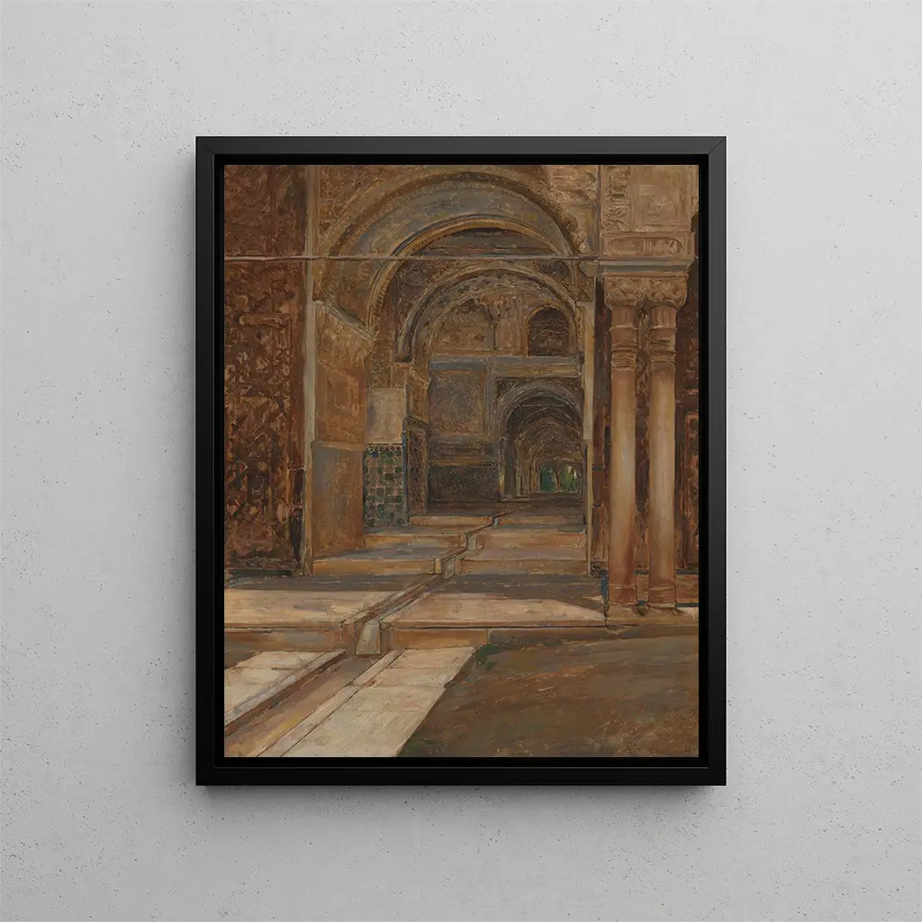 La obra se distingue por su estilo distintivo, donde el realismo se combina con una sensibilidad artística propia de Émile Vloors. Los colores vibrantes y las texturas delicadas se unen para ofrecer una visión casi táctil de la Alhambra. Los motivos geométricos y florales, característicos del arte islámico, se representan con una precisión que demuestra el profundo respeto del artista por las tradiciones de la arquitectura andaluza. Vloors no se limita a reproducir un paisaje; logra infundir una nueva vida a esta escena histórica, jugando con la luz para crear efectos de sombra que añaden profundidad y misterio. Cada elemento de la obra está cuidadosamente pensado, desde los arcos majestuosos hasta los detalles ornamentales, permitiendo al espectador explorar las múltiples capas de historia y cultura que impregnan este lugar.