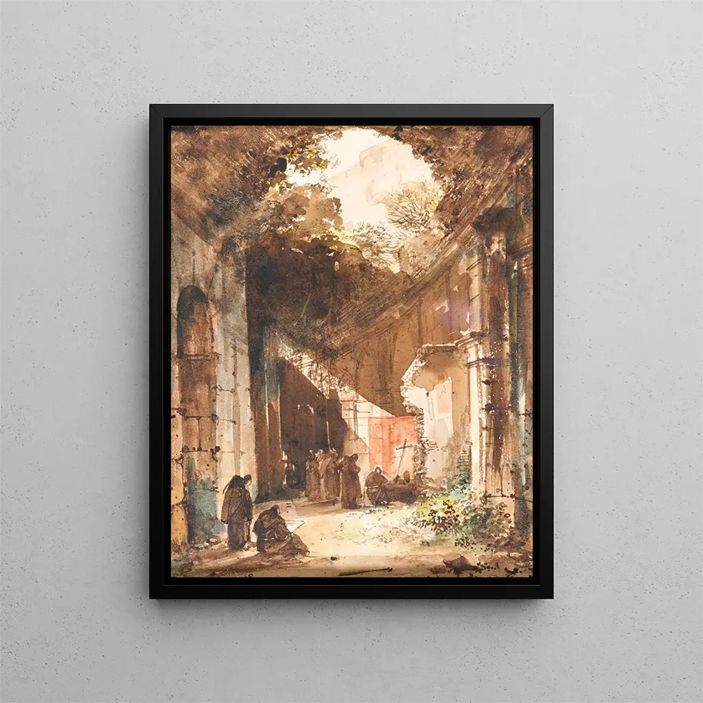 El estilo de Granet se distingue por una finura notable y un dominio de las luces y las sombras. En "Monjes en el Coliseo", la paleta de colores elegida evoca una atmósfera de serenidad, donde los tonos suaves y las matices delicadas se funden armoniosamente. Los monjes, figuras centrales de la composición, están representados con gran atención a los detalles, sus ropas oscuras contrastando con la luminosidad ambiental del sitio antiguo. La perspectiva utilizada por Granet crea una profundidad que invita a la exploración visual, permitiendo que la mirada se pierda en las ruinas majestuosas del Coliseo. Este cuadro es una verdadera oda a la belleza del patrimonio, donde cada pincelada parece contar una historia, la de un encuentro entre la fe y la herencia cultural.