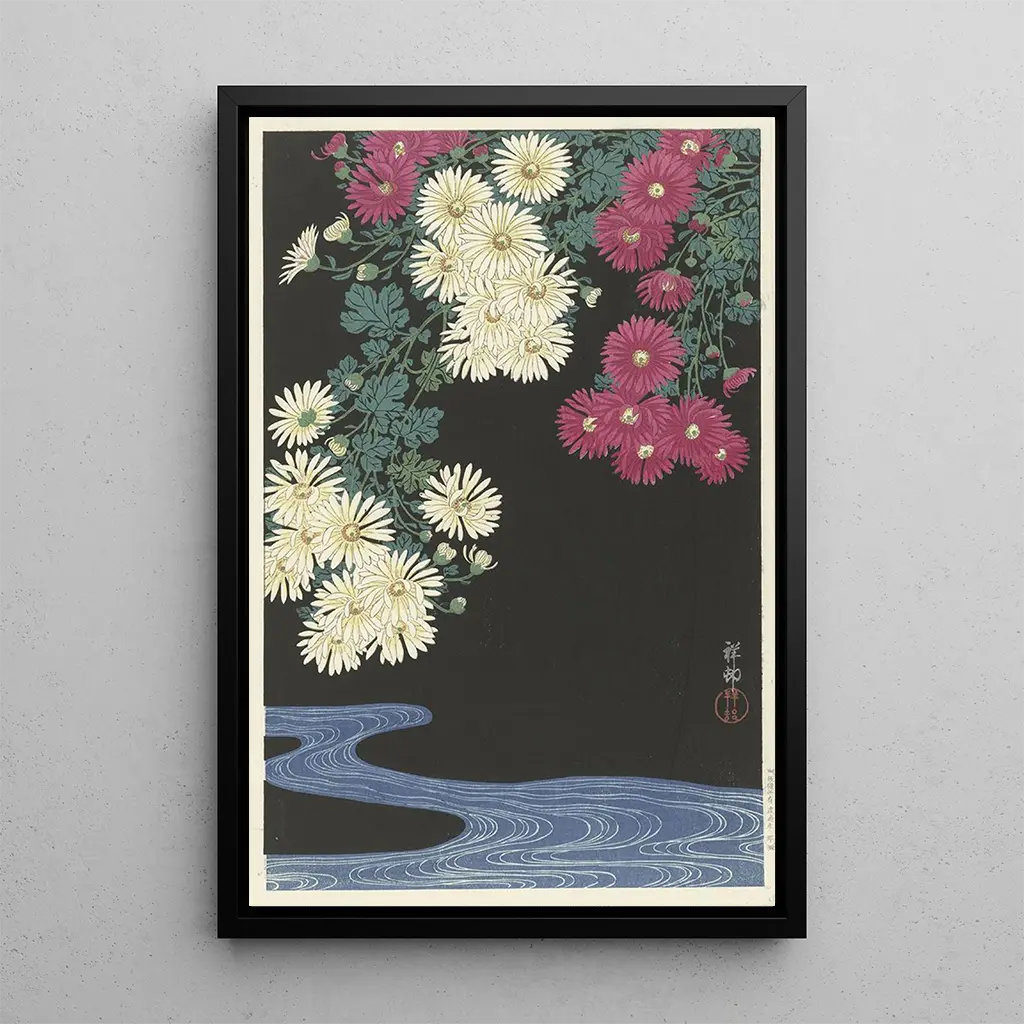 Impresión artística | Crisantemos y agua corriente - Ohara Koson