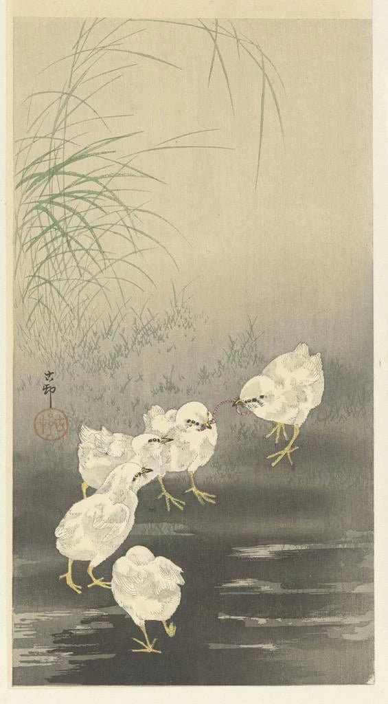 Impresión artística | Polluelos y abejas - Ohara Koson