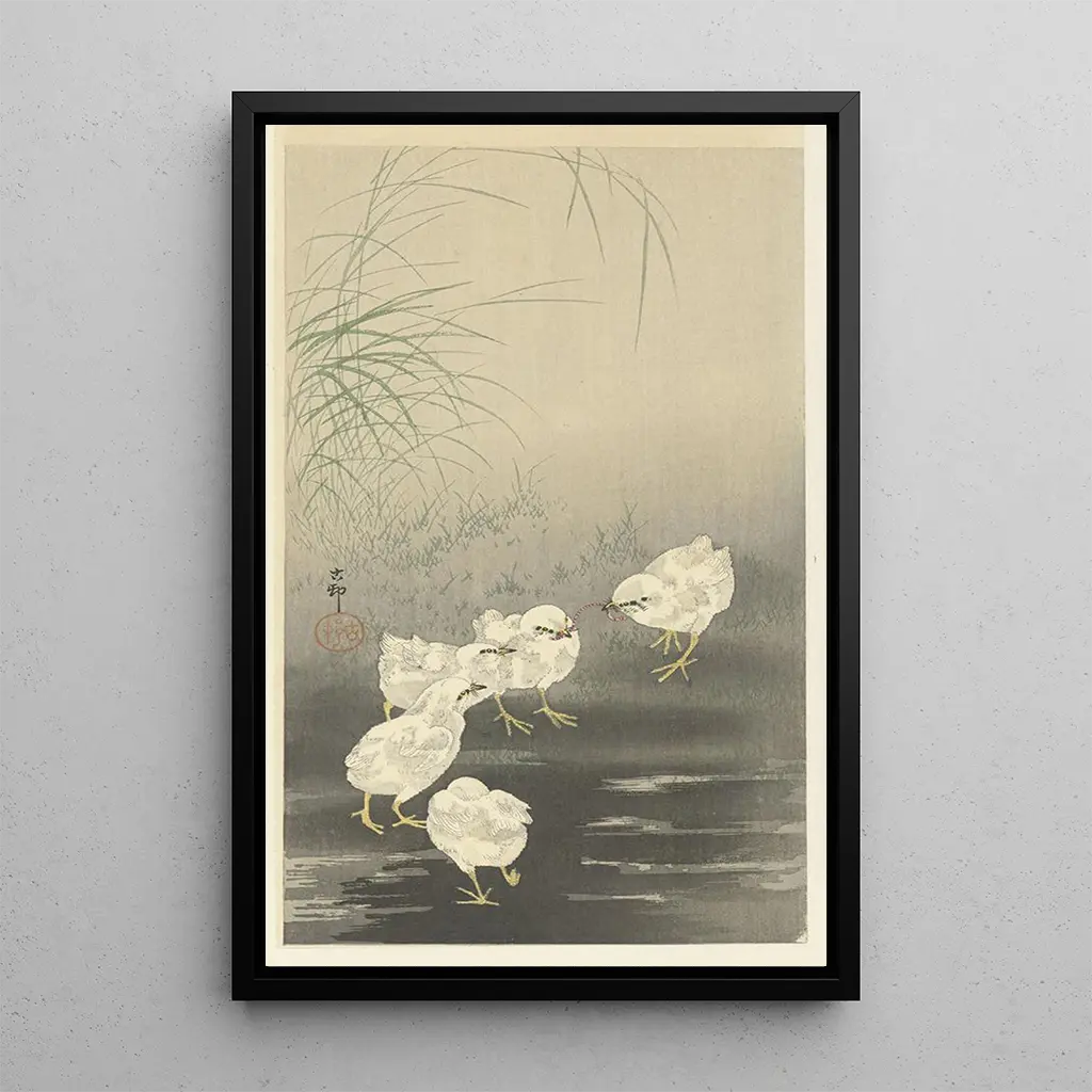 La impresión artística de la obra "Pajaritos y gusano" de Ohara Koson nos sumerge en un universo lleno de dulzura y serenidad. Los pajaritos, representados con una minuciosidad notable, parecen emerger de un mundo pacífico, mientras que el gusano, símbolo de la naturaleza, se integra armoniosamente en esta escena. Los colores pastel, dominados por tonalidades suaves de amarillo y verde, crean una atmósfera tranquilizadora. La técnica de grabado en madera, característica del arte japonés, confiere a esta obra una textura única, casi táctil, invitando al espectador a sumergirse en esta representación delicada de la vida salvaje.