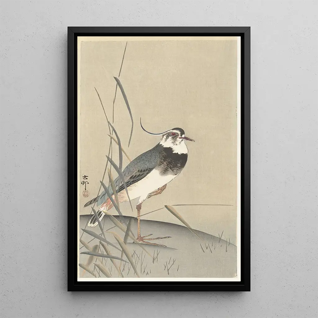 "Vanneau y caña" de Ohara Koson es una obra que captura la belleza sencilla y salvaje de la naturaleza. La impresión artística representa un vanneau, elegante y grácil, que se encuentra entre las cañas, símbolo de la tranquilidad de los ambientes acuáticos. Los colores suaves y naturales, que van desde verdes hasta marrones, evocan una atmósfera pacífica, mientras que la técnica de la impresión artística resalta los detalles sutiles del plumaje del ave y la textura de las plantas circundantes. Esta obra invita a una contemplación silenciosa, donde casi se puede escuchar el murmullo del agua y el canto de los pájaros.