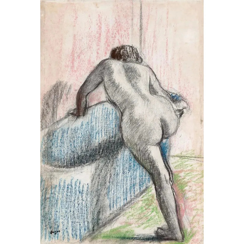 En esta obra emblemática, Edgar Degas captura un momento de tranquilidad e intimidad a través de la representación de una mujer tomando un baño. Los colores suaves y las tonalidades de luz crean una atmósfera relajante, mientras que la composición destaca la curva delicada del cuerpo femenino. La técnica del pastel, utilizada por Degas, permite reproducir la textura del agua y la suavidad de la piel con gran finura. Este cuadro evoca una sensación de serenidad, invitando al espectador a adentrarse en este momento de la vida cotidiana, celebrando la belleza del cuerpo humano.