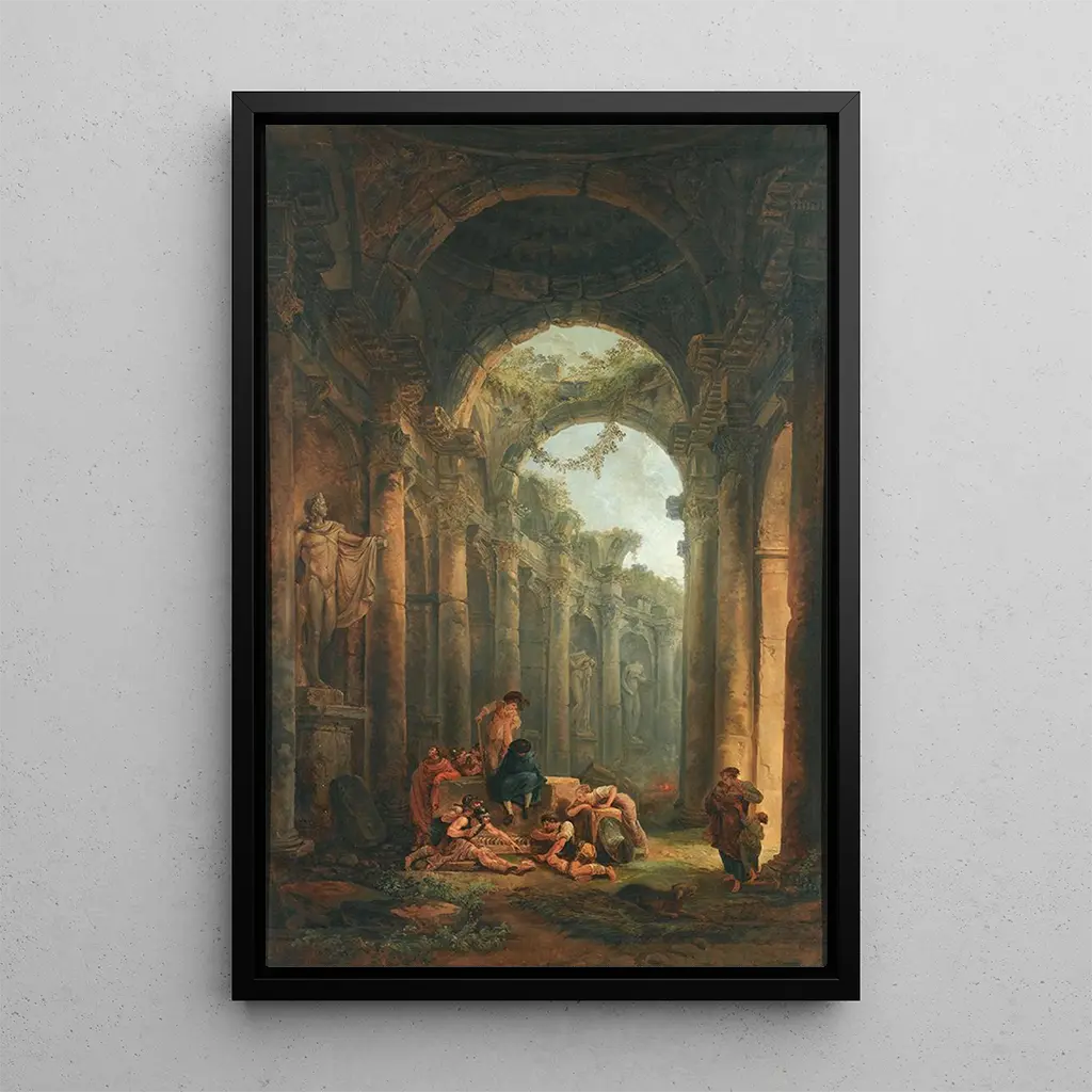 Hubert Robert, figura emblemática del siglo XVIII, es reconocido por su capacidad para fusionar lo real y lo imaginario. Formado en la Academia real de pintura y escultura, se inspira en los grandes maestros italianos para desarrollar su propio estilo. Sus obras, a menudo pobladas de ruinas y paisajes idealizados, reflejan un interés marcado por la antigüedad y la naturaleza. Como pintor de corte, supo capturar el espíritu de su tiempo, combinando hábilmente la belleza de los paisajes con escenas de la vida cotidiana. Su legado artístico perdura, testimonio de la importancia de la imaginación en el arte.