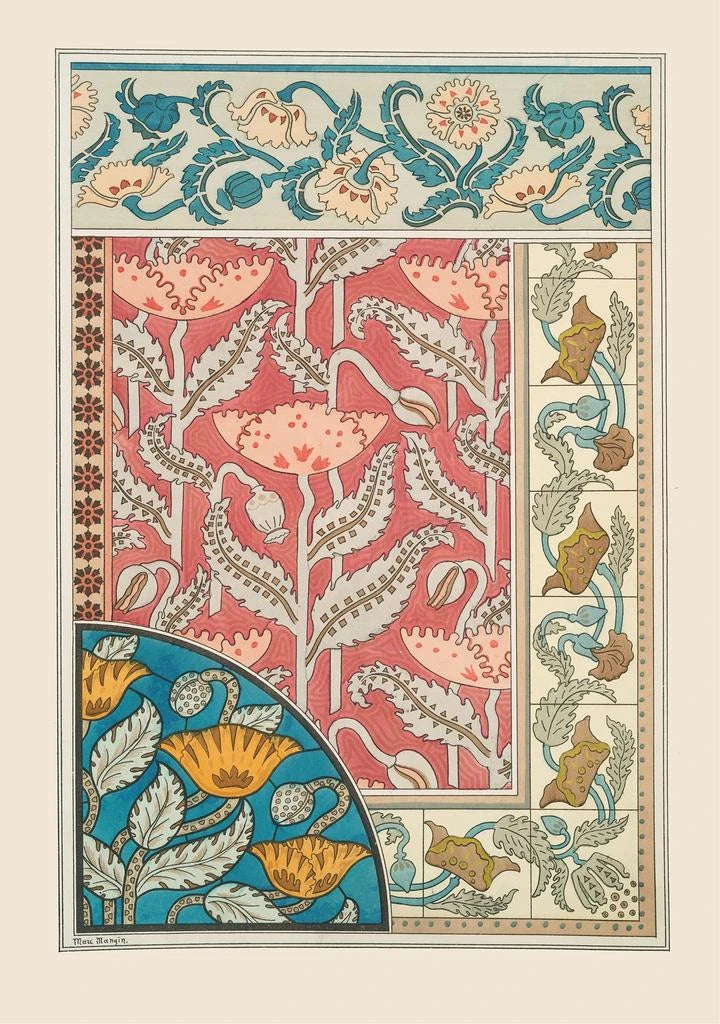 Maurice Pillard Verneuil, activo a finales del siglo XIX y principios del XX, es reconocido por su papel principal en el movimiento de la impresión artística decorativa. Influenciado por el impresionismo y el art nouveau, supo integrar elementos naturales en sus obras, rindiendo homenaje a la belleza del mundo vegetal. Sus creaciones, a menudo inspiradas en la flora, reflejan un profundo respeto por la naturaleza y una búsqueda de armonía. Verneuil también colaboró con artesanos y diseñadores, contribuyendo a la evolución del diseño de interiores de su época, lo que le confiere un lugar importante en la historia del arte.