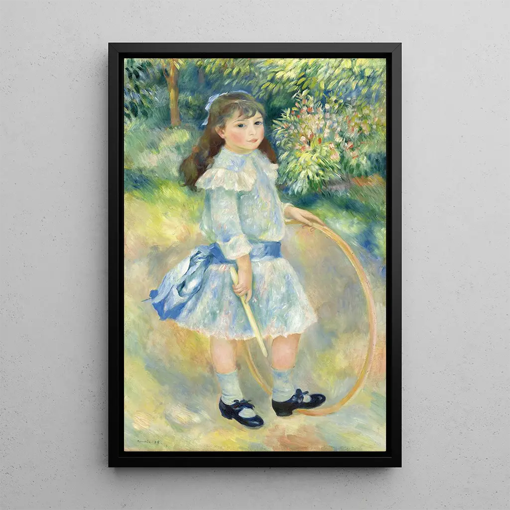 En esta obra vibrante, Pierre-Auguste Renoir captura la despreocupación de la infancia a través de la figura de una joven jugando con un cerco. Los colores brillantes, que van desde rosas suaves hasta verdes luminosos, crean una atmósfera alegre y ligera. La técnica impresionista de Renoir se manifiesta mediante pinceladas fluidas y juegos de luz, dando vida a la escena. La composición, centrada en la niña, evoca un sentimiento de movimiento y libertad, invitando al espectador a compartir este momento de felicidad simple.