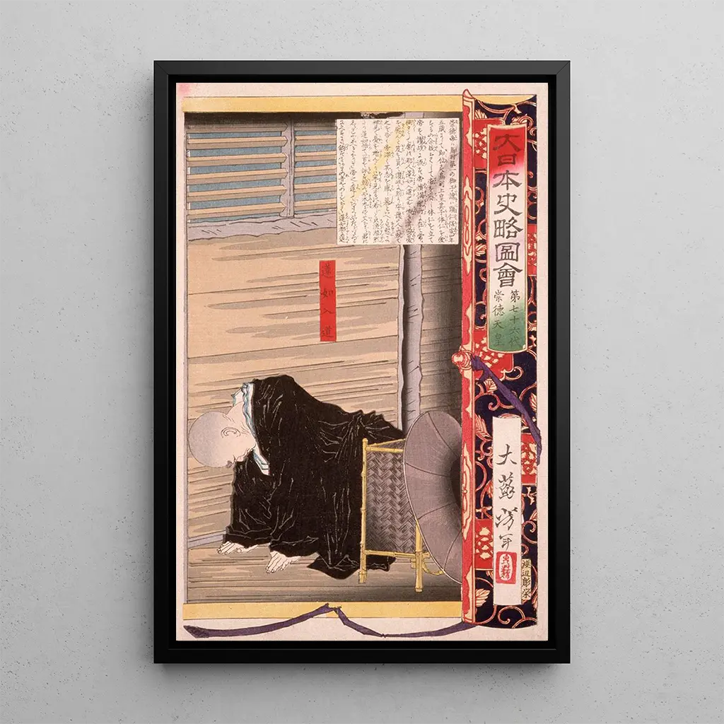 La impresión artística del cuadro Soixante-seizième empereur Sutoku de Tsukioka Yoshitoshi evoca una atmósfera de nostalgia y tristeza. La figura central, el emperador Sutoku, está representada en colores delicados, combinando matices de azul y rojo que resaltan su expresión pensativa. La técnica del grabado en madera, típica del arte ukiyo-e, confiere a la obra una textura única, casi táctil. Los detalles minuciosos en la vestimenta y los accesorios añaden una dimensión histórica, transportando al espectador al Japón del siglo XII. Esta obra invita a la contemplación, revelando las tribulaciones de un gobernante caído.