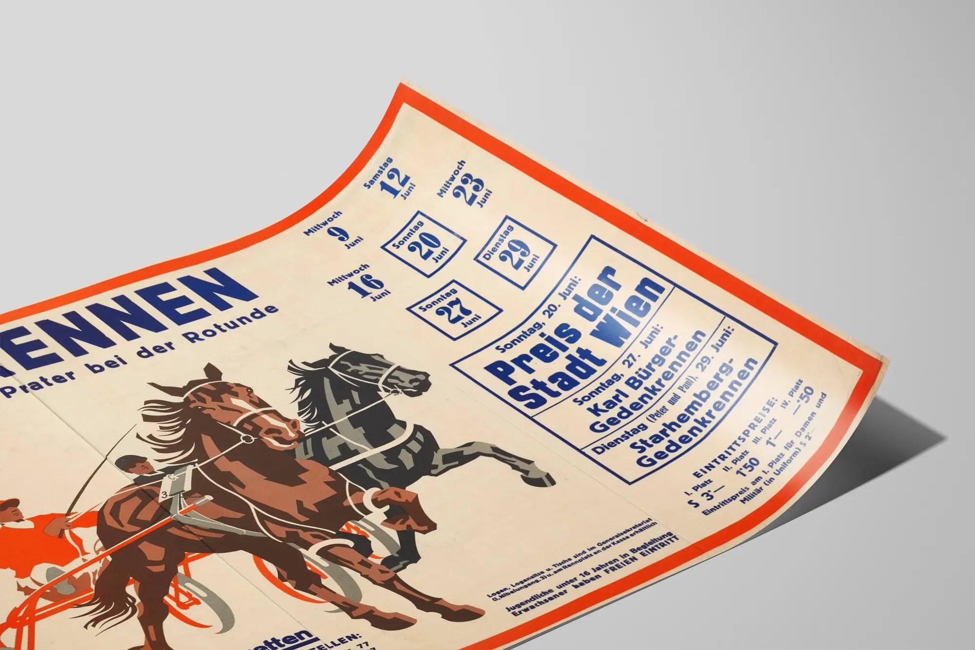 Découvrez cette affiche vintage illustrant une course de trot au Trabrenn-Platz, située dans le célèbre parc du Prater à Vienne, près de la Rotonde. Cette affiche est un véritable objet de décoration murale qui ravira les amateurs d'équitation et de sport hippique. Représentant deux chevaux attelés dans une course rythmée, ce poster capture avec dynamisme et réalisme l'essence même de la course de trot. Les couleurs dominantes bleu, rouge et beige apportent une touche rétro et chaleureuse, idéale pour une décoration murale authentique. Le graphisme met en avant les silhouettes puissantes des chevaux et l'énergie de leurs jockeys, ce qui en fait également une pièce forte pour tout intérieur contemporain ou vintage. Cette affiche est un choix parfait pour embellir un salon, une salle de sport, un bureau ou tout espace dédié à l’univers équestre. Elle s’intègre parfaitement aux styles industriels, classiques ou rustiques, en apportant une note historique et sportive. Le texte en allemand rappelle les dates des rendez-vous hippiques, renforçant l’aspect authentique et historique de cette pièce. Les inscriptions détaillent également les horaires et des informations sur les paris, ce qui ajoute à la valeur narrative de l’affiche. En ajoutant ce poster à votre collection de décoration murale, vous invitez une ambiance sportive et vintage à votre intérieur, tout en mettant en avant une scène emblématique des courses hippiques à Vienne. Une œuvre graphique qui mêle art et passion du sport, à afficher fièrement sur un mur pour capter regards et admiration.