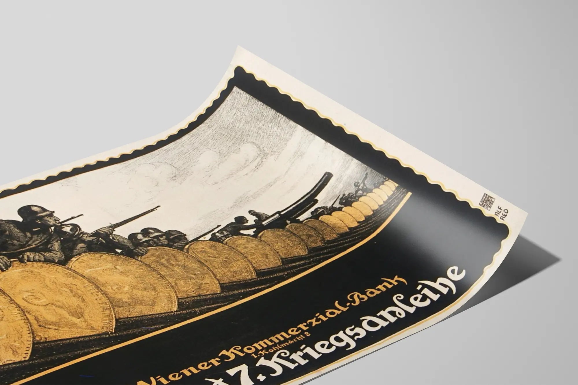Cette affiche vintage de la Wiener Kommerzial Bank est une pièce unique de décoration murale historique. Elle illustre la force et la détermination à travers une ligne de soldats en armure et casques, qui utilisent des pièces de monnaie géantes comme boucliers, symbolisant l'engagement financier dans la guerre. Ce poster met en avant un design graphique fort, avec une palette de couleurs dominée par des tons dorés et noirs, apportant une esthétique à la fois ancienne et puissante. Cette affiche convient parfaitement à une décoration murale d'ambiance historique ou militaire, idéale pour les amateurs d'art graphique et d'histoire. Elle peut aussi s'intégrer dans un intérieur à thème vintage ou industriel, renforçant une atmosphère authentique et marquante. Ce tableau mural au style ancien et détaillé est une invitation à la réflexion, révélant le lien entre finance et conflit, tout en décorant avec caractère et originalité. Son format et ses détails en font un poster attractif pour un espace d'exposition ou un salon, mêlant art et histoire. Ajouter cette décoration murale à votre collection apportera une dimension culturelle et esthétique significative.
