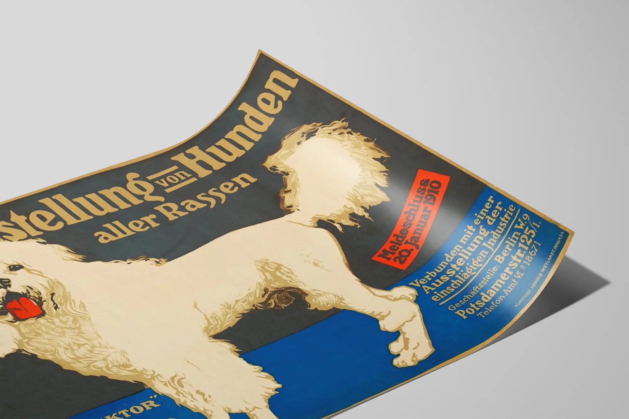 Cette affiche vintage illustre de manière artistique une exposition générale de chiens de toutes races qui s'est tenue à Berlin fin janvier 1910. C'est un bel exemple de décoration murale rétro qui saura plaire aux passionnés d'animaux et aux amateurs de graphisme historique. Le poster met en avant un grand chien blanc au pelage dense et soyeux, les détails des poils finement dessinés assurant une texture visuelle riche. Le contraste entre le fond sombre et la silhouette claire du chien crée un effet visuel de profondeur, tandis que les touches de rouge (notamment la langue du chien et le cadre signalant la date limite d'inscription) ajoutent une dynamique colorée à l'ensemble. Le lettrage en lettres majuscules, typique du début du XXᵉ siècle, renforce le caractère authentique et ancien de ce tableau. Ce type de décoration murale s'intègre parfaitement dans un environnement à l'ambiance vintage ou industrielle, que ce soit dans un salon, un bureau, ou une pièce dédiée aux animaux de compagnie. Le poster devient un hommage à l'histoire des expositions canines, un événement qui rassemblait amateurs et professionnels autour de la diversité des races de chiens. Placée sur un mur, cette affiche apporte un cachet unique et invite à la découverte d'une époque révolue où la passion pour les chiens se manifestait à travers des rassemblements prestigieux. Ce tableau mural décoratif est idéal pour ceux qui recherchent une pièce à la fois artistique et évocatrice, qui valorise le patrimoine culturel tout en sublimant l'espace intérieur avec élégance. En choisissant ce poster, vous intégrez un élément de décoration qui raconte une histoire, mêlant art, nature et tradition dans un style graphique affirmé.