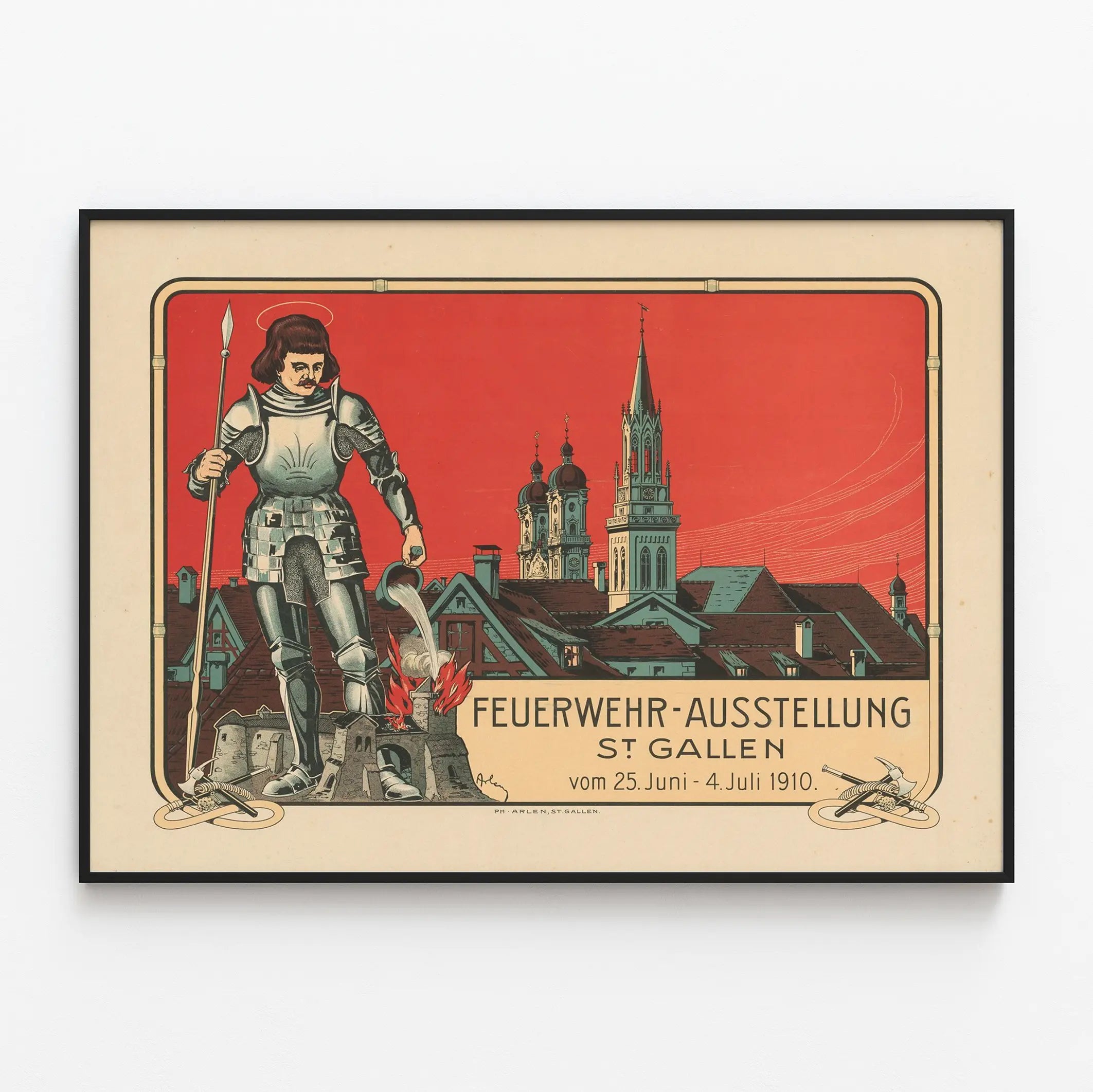 Cette affiche vintage est une superbe décoration murale qui célèbre l'exposition des pompiers à Saint-Gall, en Suisse, qui s'est tenue du 25 juin au 4 juillet 1910. Ce poster ancien présente un visuel riche et évocateur, mêlant une composition graphique forte à des éléments historiques et architecturaux. Au premier plan, un pompier en armure médiévale verse de l'eau sur un feu qui dévore une maquette de château, symbolisant l'action et le courage face au danger. En arrière-plan, les toits de la ville de Saint-Gall s'étendent avec leurs clochers caractéristiques, sur un ciel rouge intense, créant un contraste visuel saisissant. L'illustration est encadrée d'un liseré noir et rouge qui donne à cette affiche un aspect classique et raffiné. Ce poster est un excellent choix pour une décoration murale d'inspiration historique ou vintage, particulièrement adapté aux amateurs de thèmes liés à la sécurité civile, à l'histoire locale ou à l'art graphique du début du XXe siècle. Idéal pour un salon, un bureau ou une salle d'exposition, ce tableau imprimé invite à la fois à la découverte et à la contemplation. Ce support mural apporte une touche d'authenticité et d'élégance en valorisant un moment marquant de la culture régionale, tout en offrant un rendu esthétique qui capte le regard. Accrochez ce poster dans votre intérieur pour transformer vos murs en objets d'histoire et de décoration, alliant le caractère unique d'une illustration d'époque au charme intemporel d'un design soigné.