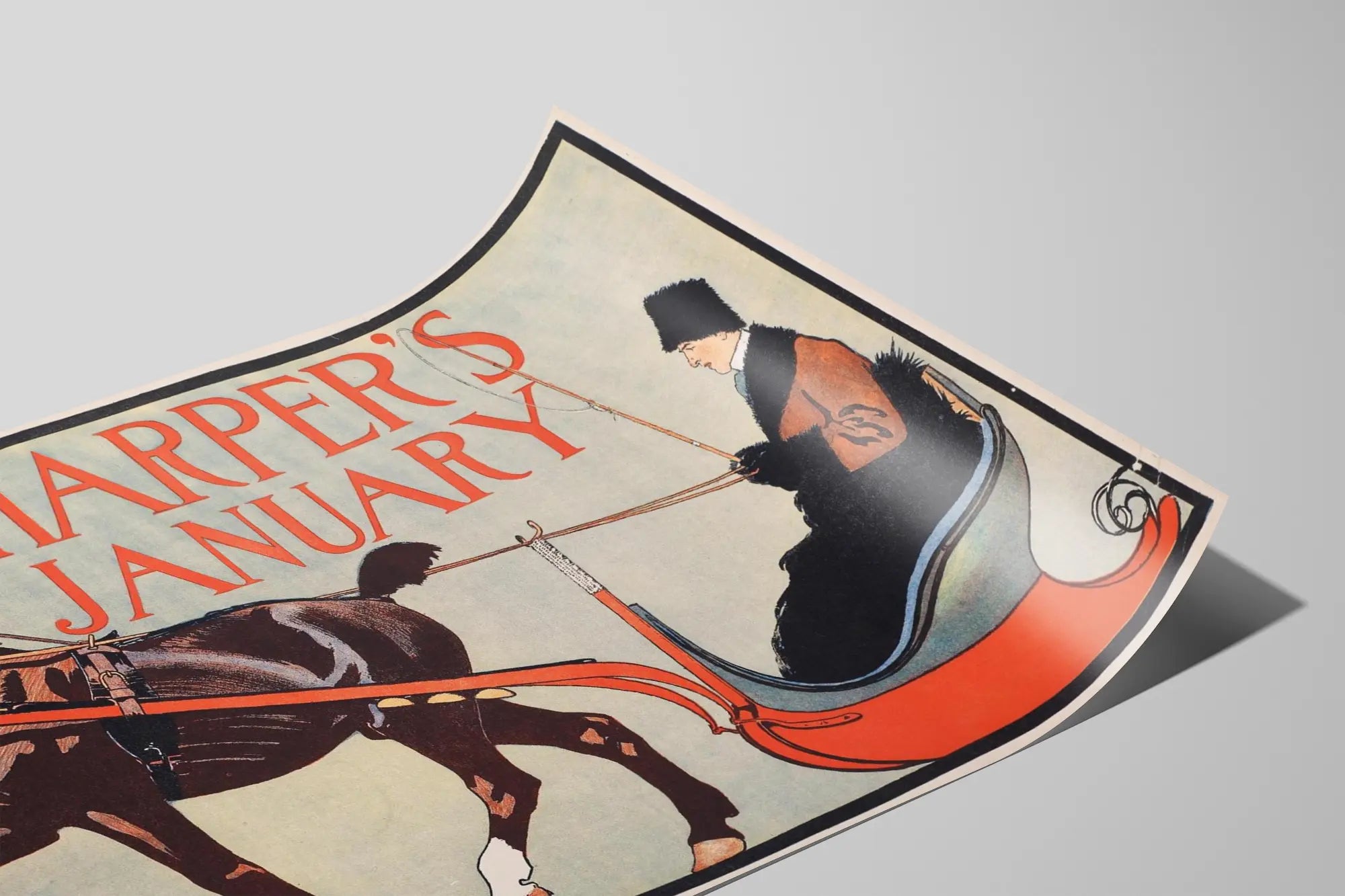 Cette affiche vintage Harper's January est une superbe pièce de décoration murale qui capture l'élégance et le charme d'une scène hivernale. On y voit un cheval en mouvement, attelé à un traîneau rouge vif, avec une personne habillée chaudement, portant un manteau et un chapeau en fourrure, tenant les rênes et un fouet. Le fond uni met en valeur les silhouettes stylisées du cheval et du conducteur, tandis que le titre "HARPER'S JANUARY" est écrit en gros caractères rouges au sommet de l'affiche, ajoutant une touche graphique distinctive. Cette affiche publicitaire ancienne illustre un moment de vie et de loisirs dans un cadre hivernal, idéale pour une décoration murale qui évoque à la fois la tradition, l'élégance et l'esprit des saisons froides. Que ce soit dans un salon, une chambre ou un bureau, ce poster apportera une touche rétro et authentique, avec une ambiance chaleureuse et saisonnière. Son design graphique et ses couleurs naturelles avec des tons chauds et froids en harmonie sont parfaits pour les amateurs d’art décoratif classique et de posters anciens. Intégrer cette affiche dans votre intérieur est une excellente idée pour personnaliser vos murs avec une image empreinte d'histoire et de style. Elle s’adapte à tous les décors, de la décoration murale traditionnelle à une touche vintage dans un intérieur plus contemporain. Cette pièce de décoration murale est aussi un cadeau original pour tous les passionnés d’illustrations anciennes et de design d’époque.