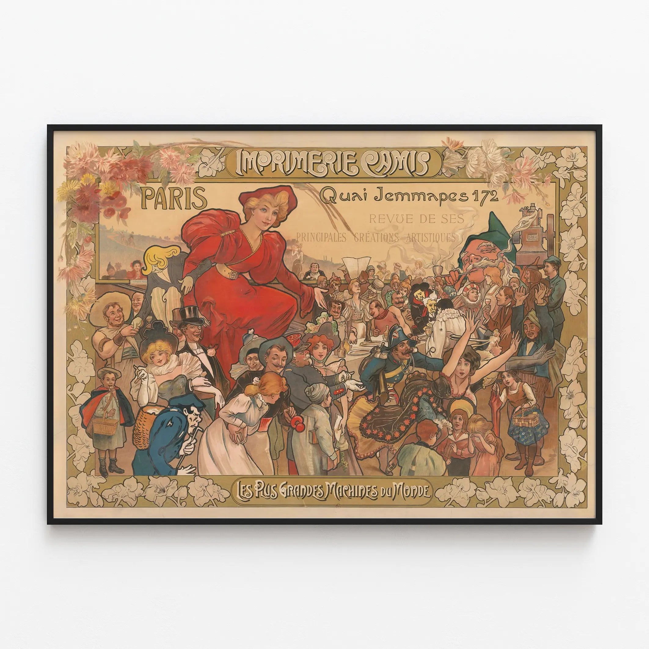 Cette affiche vintage originale de l'Imprimerie Camis, située Quai Jemmapes 172 à Paris, est une véritable pièce de décoration murale évocatrice de l'art graphique d'époque. Elle met en scène une foule animée et colorée autour d'une figure féminine en robe rouge, incarnant l'esprit artistique et festif des principales créations de l'imprimerie. Cette affiche murale ancienne, riche en détails et illustrations, évoque une scène populaire où se mélangent personnages costumés, enfants, et adultes dans un tableau vivant et dynamique. Encadrée de notes florales aux tons pastel, elle apporte charme et authenticité à tout intérieur recherchant un style rétro et élégant. Ce poster à l'allure délicatement vieillie peut sublimer un salon, un bureau ou un espace créatif en offrant un témoignage visuel unique de l'histoire de l'impression et de la publicité parisienne. Son ambiance conviviale et artistique invite à la nostalgie tout en affirmant un choix décoratif affirmé, parfait pour les amateurs de décoration murale originale et les passionnés d'art graphique ancien.