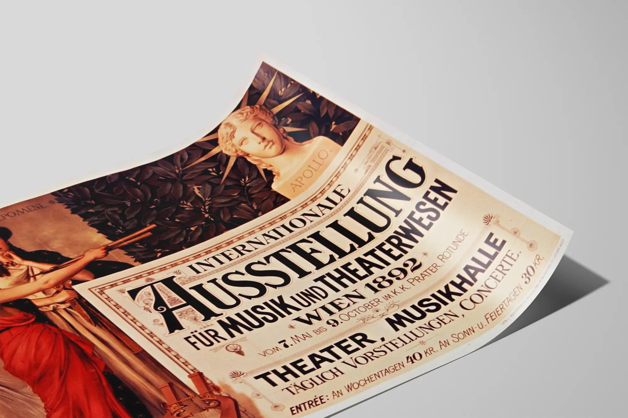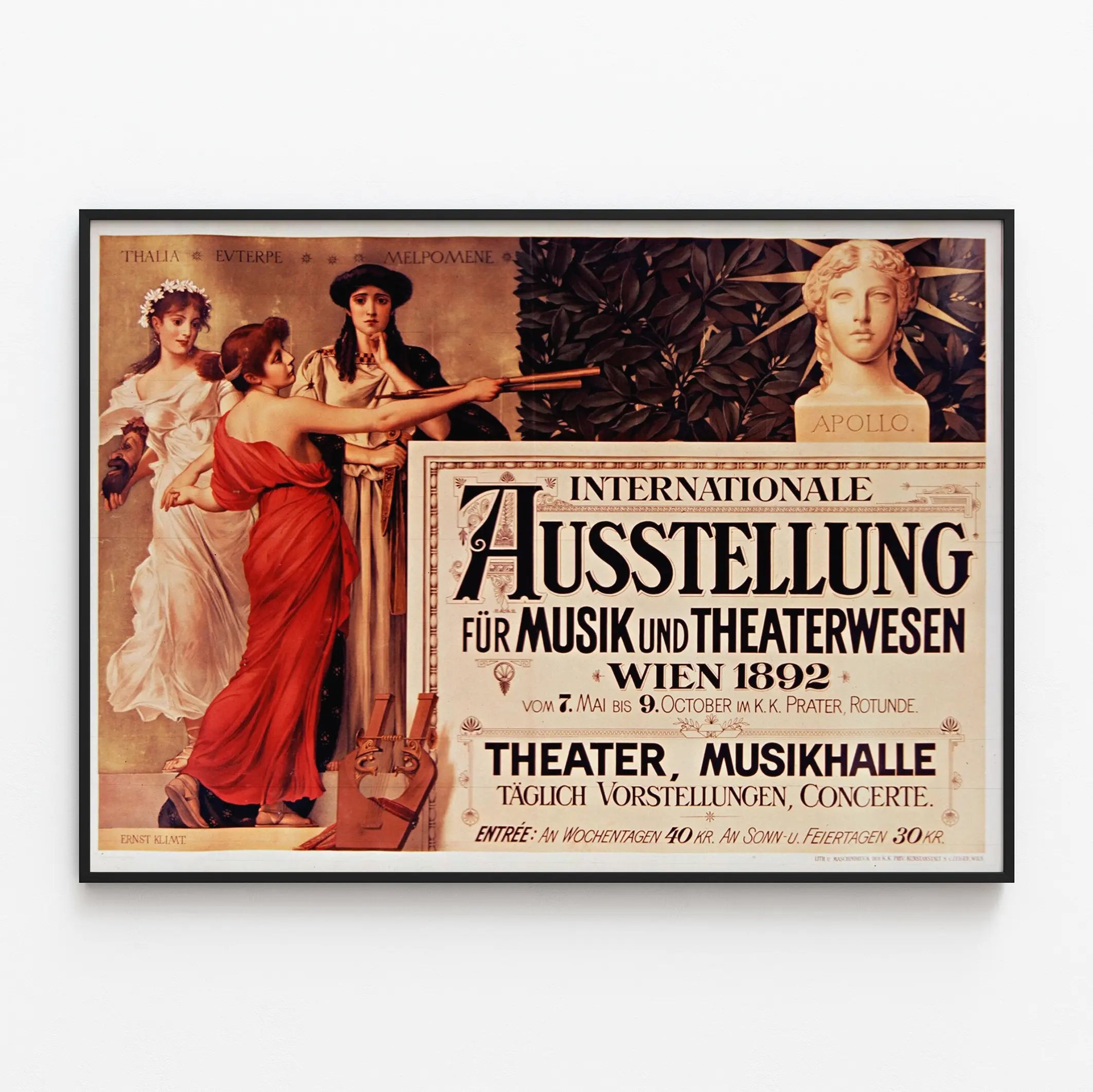 Découvrez cette superbe affiche vintage de l'Internationale Ausstellung für Musik und Theaterwesen, qui s'est tenue à Vienne en 1892. Cette œuvre annonçant un événement culturel exceptionnel, combine l'élégance artistique du XIXe siècle avec un graphisme typographique soigné, idéal pour une décoration murale authentique et raffinée. L'affiche met en scène trois figures féminines allégoriques, ornées de vêtements drapés aux couleurs harmonieuses, représentant Thalia, Euterpe et Melpomène, symboles des arts du théâtre et de la musique. Un buste d'Apollon complète la composition, incarnant l'inspiration artistique. Le texte en lettres noires bien contrastées met en avant le programme de la manifestation, avec des spectacles quotidiens de théâtre et de concerts à la salle Musikhalle du Prater à Vienne. Ce poster ancien est un choix parfait pour les passionnés d'histoire culturelle et les amateurs d'art classique, apportant une touche sophistiquée et historique à tout intérieur. Que ce soit pour une ambiance vintage dans un salon, un bureau ou une salle dédiée à la musique et au spectacle, cette affiche contribue à créer une atmosphère unique, mêlant patrimoine et esthétique décorative. Facile à encadrer, elle s'intègre harmonieusement à différents styles de décoration murale, du plus traditionnel au plus contemporain, révélant un goût prononcé pour les arts intemporels.