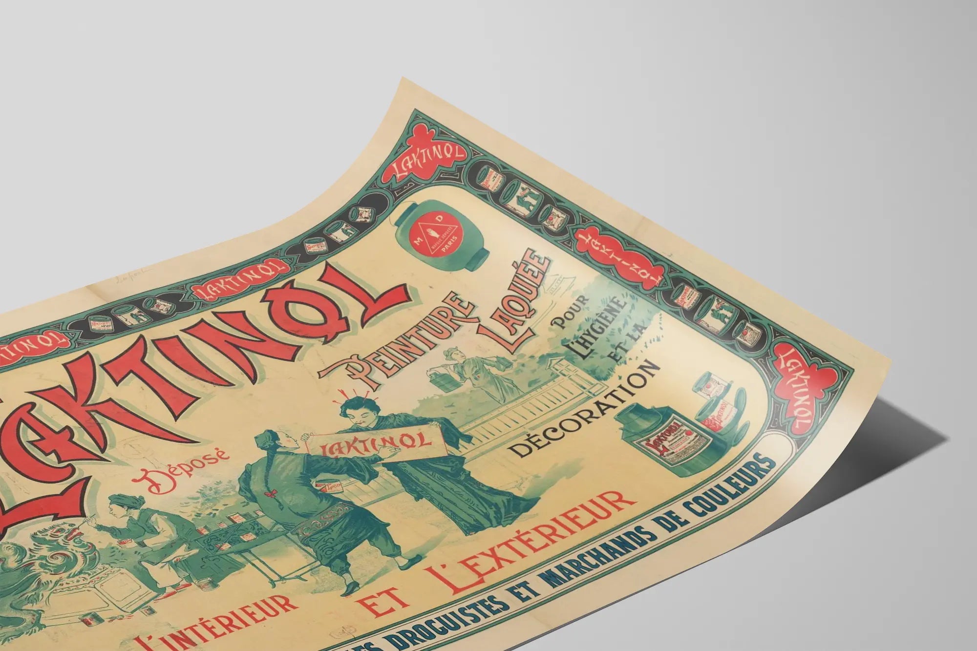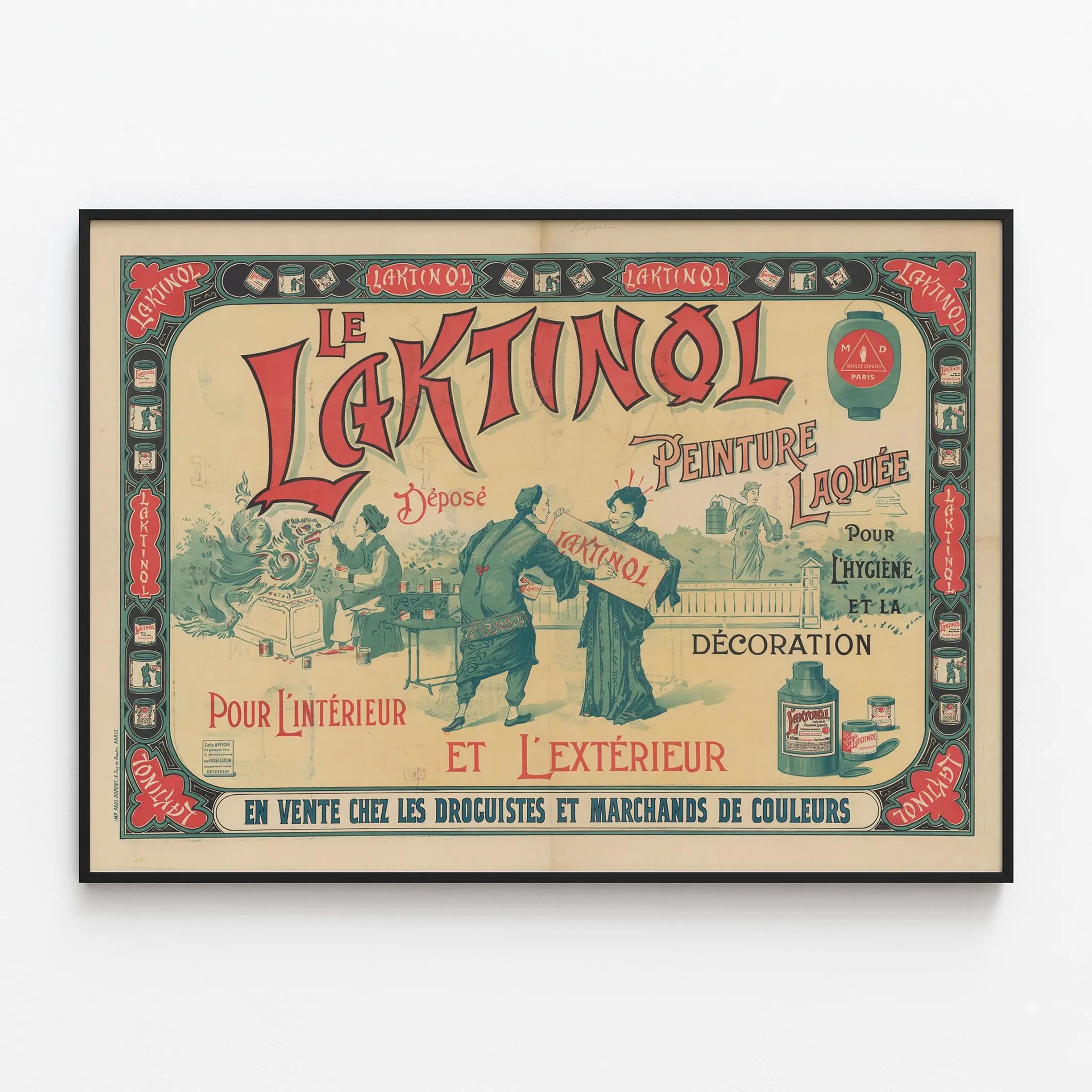 Découvrez cette affiche vintage publicitaire pour la peinture laquée Le Laktinol, conçue pour allier hygiène et décoration. Ce poster retrace un style rétro unique, mettant en avant une peinture adaptée à l'intérieur comme à l'extérieur. Parfait pour les amateurs de décoration murale et les passionnés de design d'époque, ce tableau publicitaire illustre avec finesse les usages variés de la peinture Le Laktinol, qui promettait à la fois protection et esthétisme. Le graphisme utilise des couleurs douces et un cadre décoratif riche, soulignant la qualité de la marque. Cette affiche se présente comme un élément décoratif mural idéal pour apporter une touche d'authenticité et d'histoire à votre intérieur. Encadrée ou accrochée telle quelle, elle s'impose comme une pièce maîtresse de décoration vintage, pour un design à la fois élégant et évocateur du passé. Parfaite pour enrichir un mur, elle séduira ceux qui apprécient les affiches d'époque et souhaitent intégrer un élément de décoration mural original à leur espace, apportant une note artistique et colorée inspirée des affiches publicitaires d'antan. Cette affiche est un hommage au savoir-faire dans le domaine de la peinture laquée, utilisée pour la décoration murale et les surfaces nécessitant hygiène et résistance. Une pièce unique qui plaira aux collectionneurs comme aux décorateurs à la recherche d'authenticité pour leur décoration intérieure et extérieure.