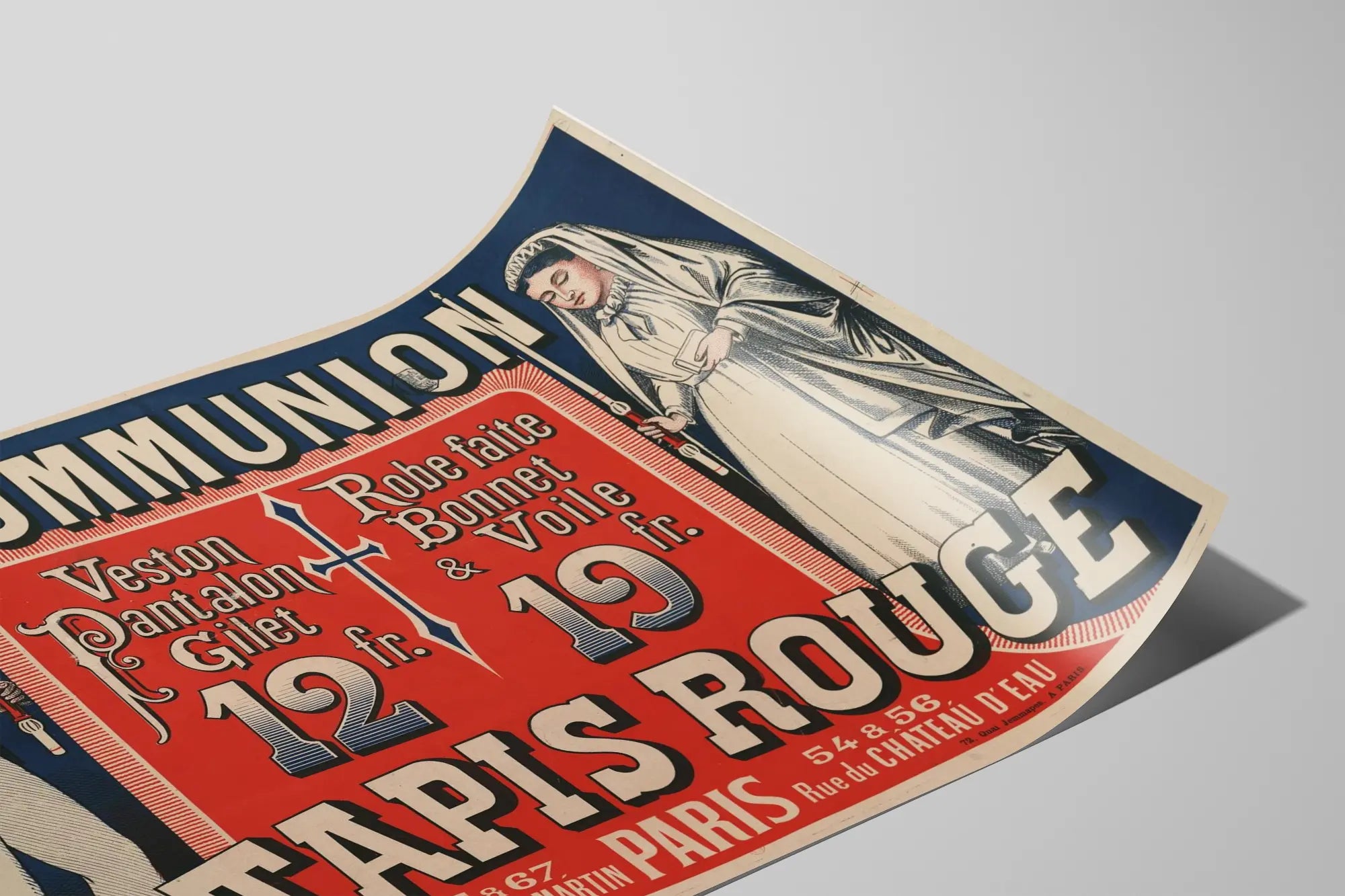 This vintage poster depicts an advertisement for First Communion outfits, highlighting a boy and a girl dressed respectively in a suit and a ceremonial dress, typical of the religious first communion. Against a contrasting blue and red background, it showcases the items offered at the store Au Tapis Rouge, located at 65-67 rue du Faubourg Saint-Martin in Paris. The boy wears a jacket, trousers, and a vest, while the girl sports a dress with a bonnet and veil, each holding a candle, traditional symbols of this celebration. This old advertising poster combines stylized graphics with bold, decorative typography, characteristic of posters from the early twentieth century.