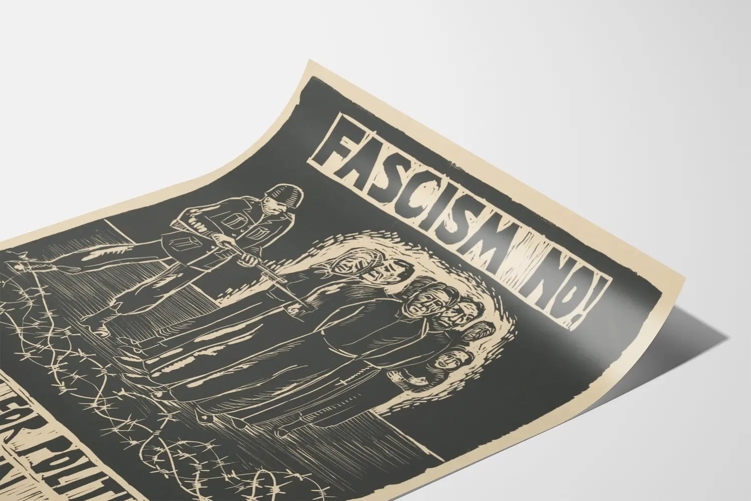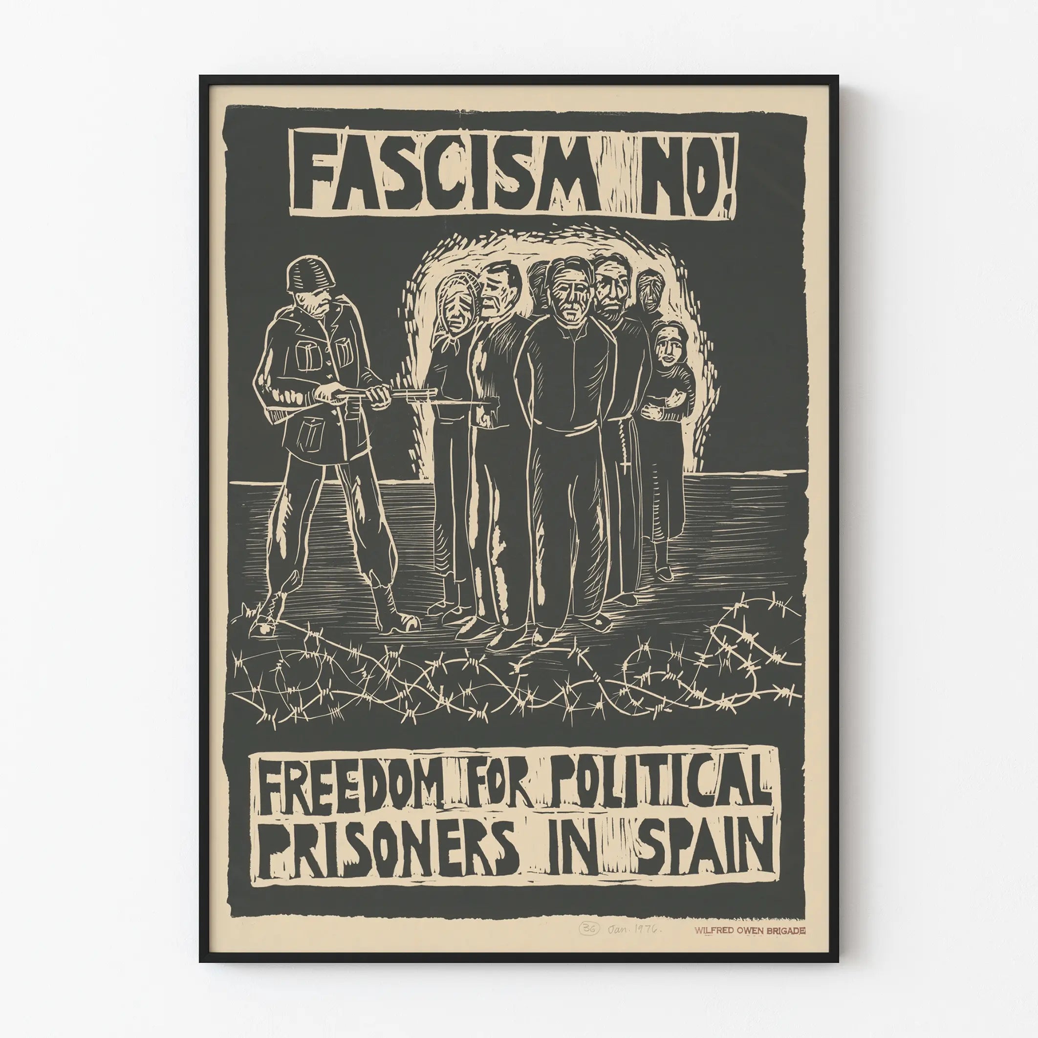 This wall poster with bold, contrasting graphic style depicts a powerful message against fascism and in support of political prisoners' freedom in Spain. The composition features a group of individuals with faces marked by fear and resignation, lined up before an armed soldier, symbolizing oppression and political repression. In the background, a light illuminates the characters, emphasizing their prominence and heightening the dramatic tension of the scene. The lower border is decorated with barbed wire, highlighting the notions of captivity and the fight against injustice. The text in uppercase letters, “FASCISM NO!” and “FREEDOM FOR POLITICAL PRISONERS IN SPAIN,” underscores the urgency of the cause. This poster, suitable as a print or engaged wall decoration, adds a historical and activist dimension to any space. It is especially suitable for enthusiasts of wall decor that aims to convey a social message. Its monochrome design with predominantly dark tones integrates well into modern or industrial interior decor. Choosing this poster offers a striking wall decoration rich in symbolism, encouraging reflection on themes of fascism, resistance, and human rights. This printed artwork is a unique choice to enrich a collection of political art or simply to adorn a wall with a meaningful decorative piece.