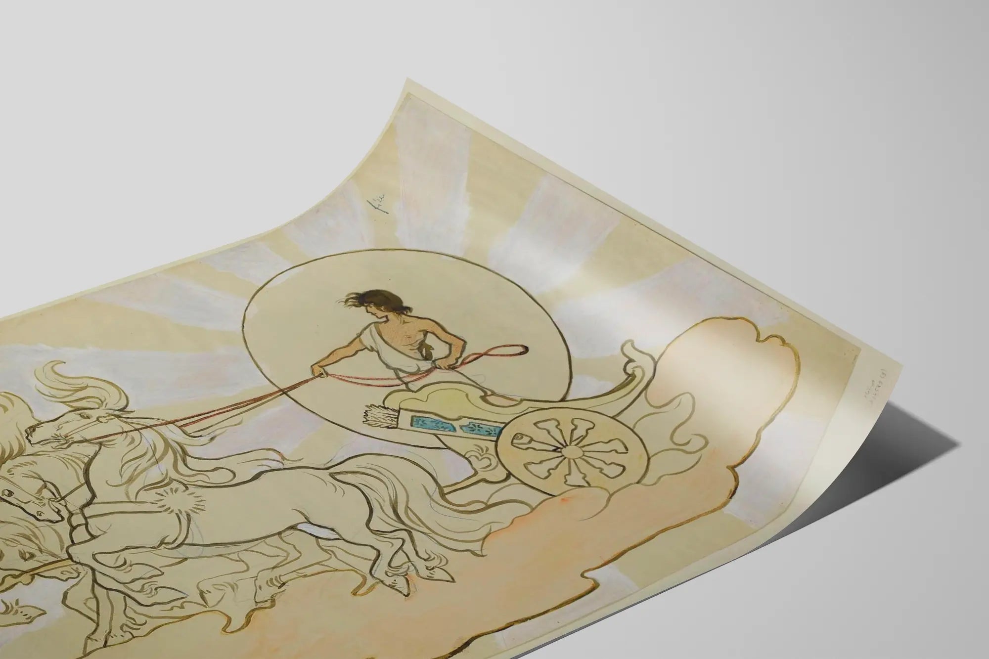 This artistic poster offers a unique wall decoration depicting Joel on his chariot, connected to four dynamic horses, in a scene inspired by the play "Joel's Dream." The line drawing highlights a style that is both classic and minimalist, with a subtle interplay of golden outlines and pastel shades that suggest light and movement. The image is centered on a young man with delicate features, firmly holding the reins of his horses, which seem to gallop on a floating cloud. This dreamlike atmosphere adds a poetic touch to your interior, ideal for art and mythology enthusiasts. As a wall decoration piece, this art print or poster is perfect for creating an elegant and charming focal point in a living room, office, or cultural space. It integrates seamlessly into an interior decor blending classicism and minimalist modernity. This visual invites daydreaming and escapism, embodying a balance between strength and gentleness. For lovers of theatrical art or symbolic paintings, this art print is a refined decorative choice that stimulates imagination and enriches the ambiance of the room. Adding this wall piece to your collection brings an artistic, intellectual touch and a breath of poetry to the heart of your decor. Its timeless character harmonizes with various color palettes and furniture styles, from contemporary to more traditional.