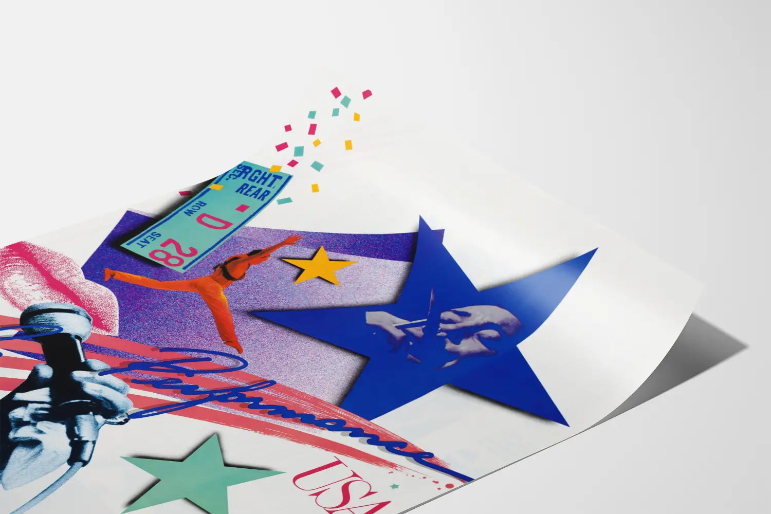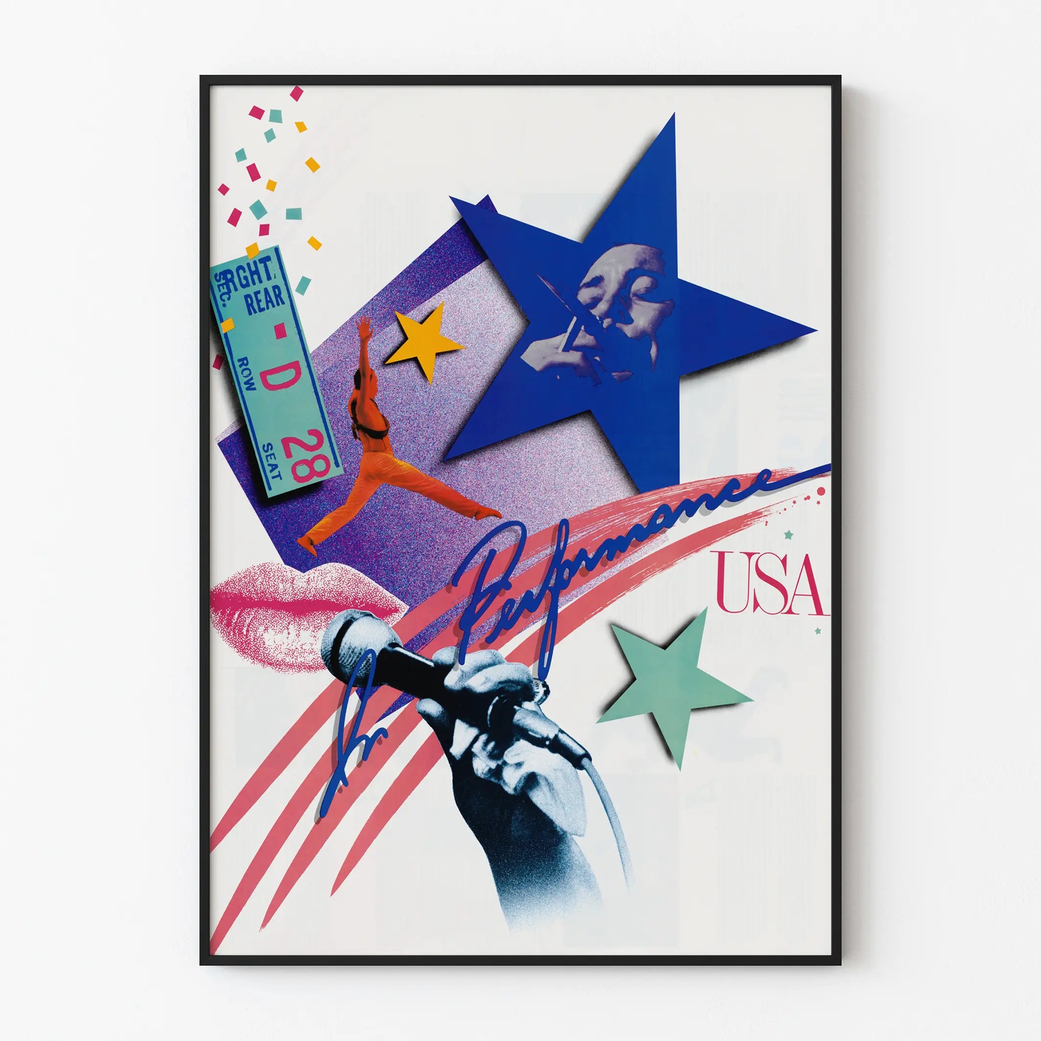 Discover this poster with a contemporary and dynamic design, perfect for adding an artistic and energetic touch to your wall decor. This poster features a rich composition centered around the theme of artistic performance in the United States. It showcases a carefully arranged collage including a hand holding a microphone, a powerful symbol of the music scene and live entertainment. Surrounding it, several colorful stars and a female figure in full action suggest the diversity and intensity of artistic performances. Graphic elements such as the seat ticket, confetti, and lip motifs give this wall decoration a festive and lively dimension. The color palette blends vibrant shades like blue, red, yellow, and green, which help highlight every detail while creating a harmonious balance on a light background. This poster is perfectly suited for all contemporary spaces, whether a living room, a creative office, or even a room dedicated to arts and performances. Its pop art and collage style impress with its originality and contagious energy. It will attract attention while infusing a dynamic and inspiring atmosphere into your interior. As a wall decoration object, this poster adapts equally well to modern interiors and more eclectic spaces where artistic elements are highlighted. Its graphic design symbolizes passion for the stage and artistic expression in America, making it a relevant choice for enthusiasts of music, dance, and stage performance. Add this decorative poster to your collection to enrich your walls with a unique and meaningful visual. Perfect as a gift for lovers of contemporary art and culture, it serves as a striking decorative element that stimulates creativity and emotion. It easily integrates into various interior styles thanks to its versatile design and contrasting colors that add depth to your walls. Choose this original poster to create a warm and welcoming artistic corner at home, with wall decor that celebrates the American artistic scene and its vibrant spirit. This graphic piece is a true invitation to performance and spectacle, ideal for expressing your passion for the arts and energizing your environment.