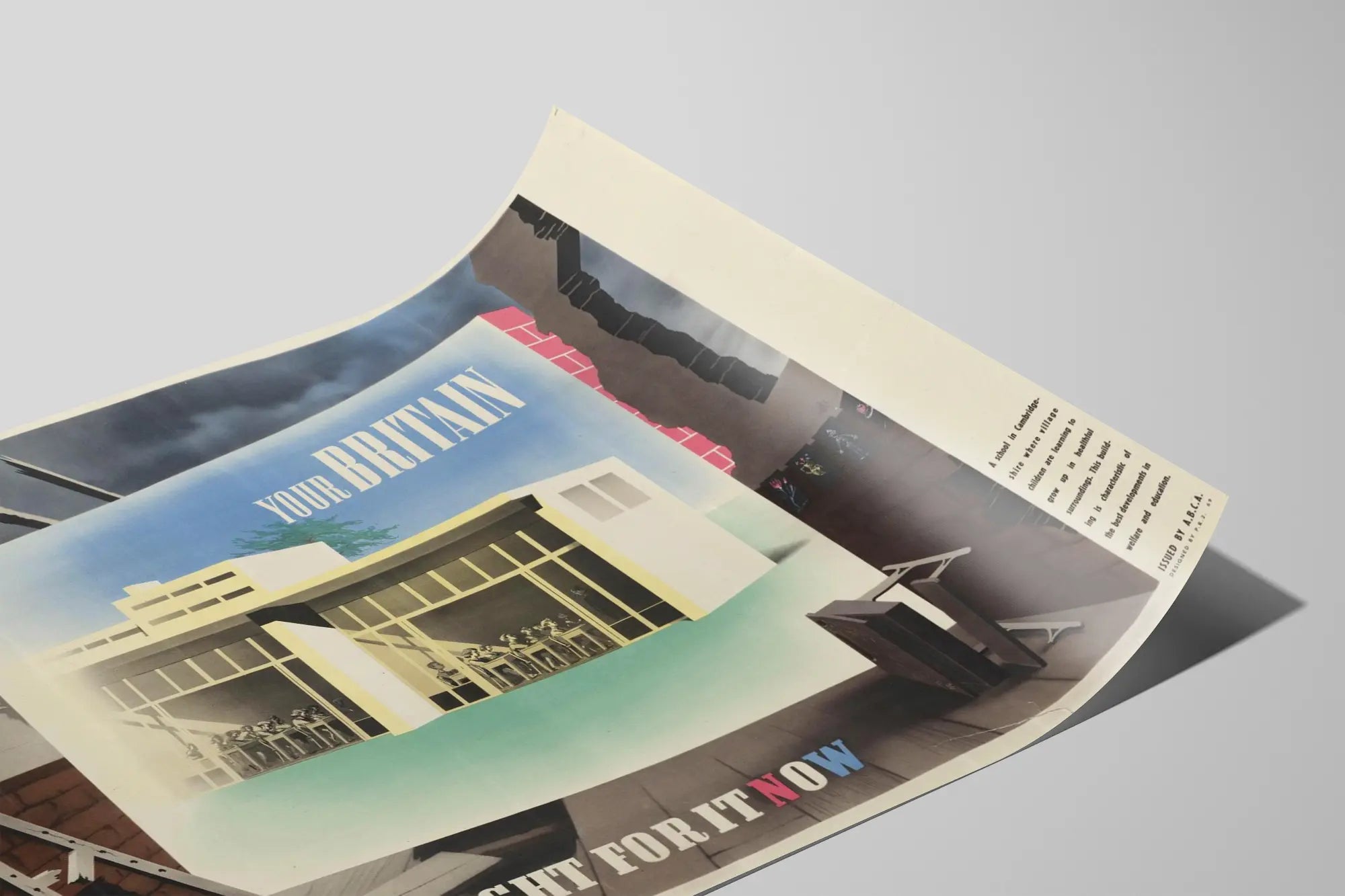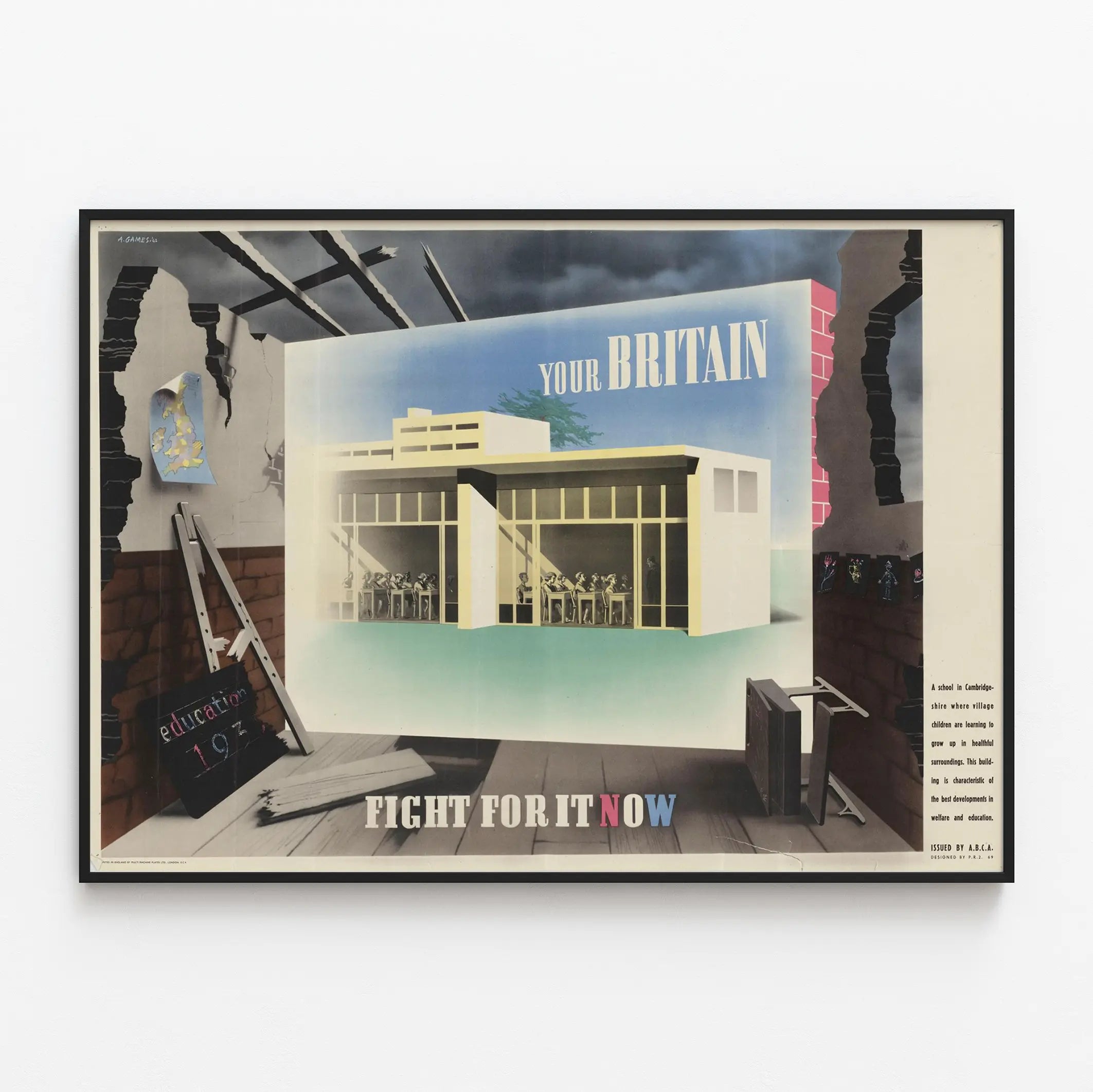 This vintage poster titled « Your Britain Fight For It Now » depicts a modern school located in Cambridgeshire, emphasizing a strong message about education and social development. Representing a bright and functional classroom, this poster highlights advances in well-being and education, reminding us of the importance of quality school infrastructure in British villages. The poster contrasts the modernity of the school, where children are seated in rows under clear cubic architecture, with a dilapidated and dark setting in the foreground, symbolizing challenges and the urgent need to act to improve learning conditions. This wall picture is an excellent choice for enthusiasts of history, education, and vintage decoration. Its soft colors blend pastel tones with deep contrasts for a striking visual effect that captures the eye. The inscription « Your Britain » at the top and « Fight For It Now » at the bottom serve as a call for collective mobilization around a socially significant theme. Ideal for wall decoration in an office, a classroom, or a cultural workspace, this poster combines a committed message with authentic retro aesthetics. It highlights the importance of education as the foundation of social well-being and reflects a period marked by efforts to transform the school environment. Choose this poster as a unique decorative element that will enrich your walls with its historical significance and distinctive graphics, while emphasizing a universal and ever-relevant cause: fighting for a better future through education.