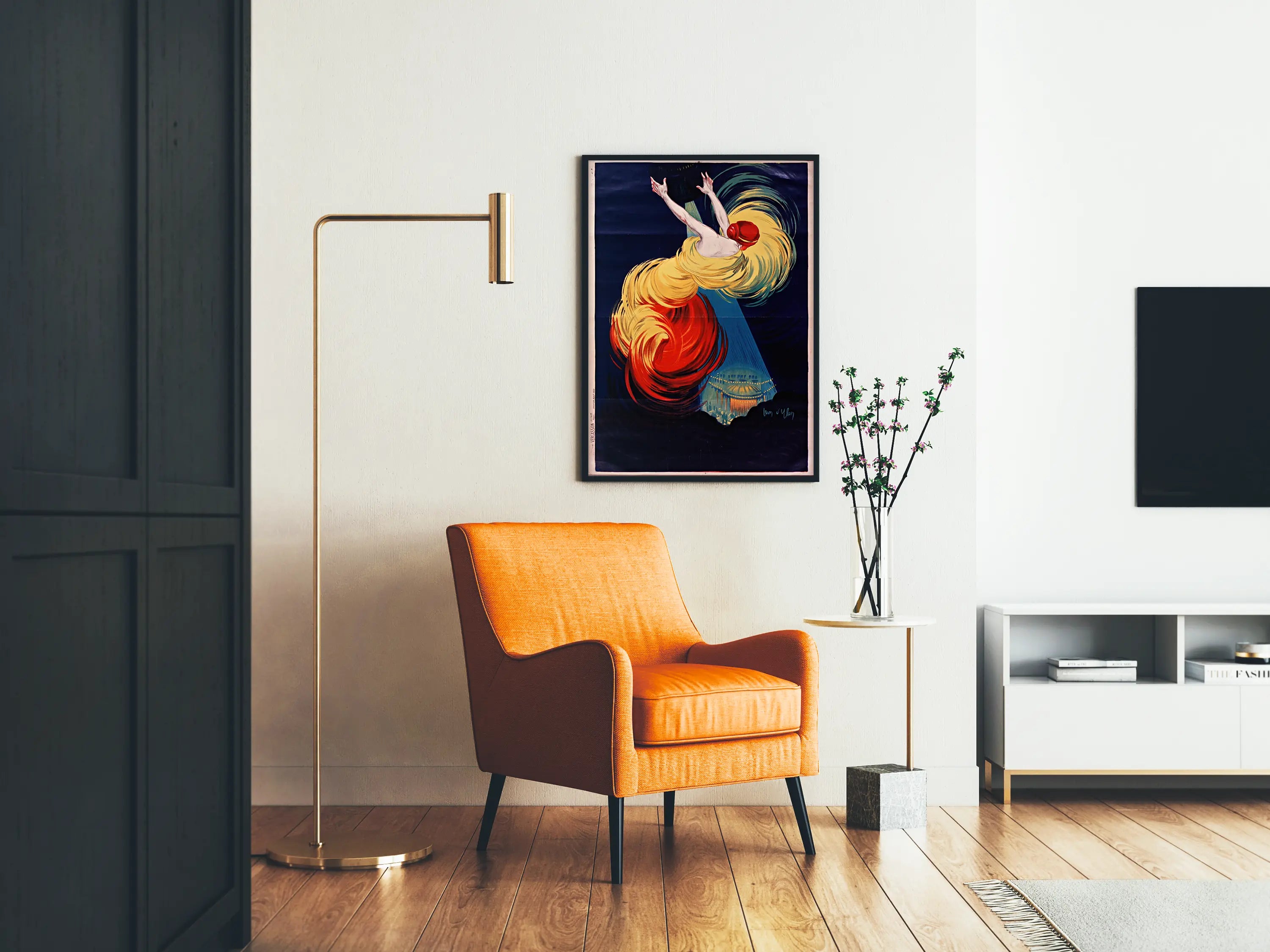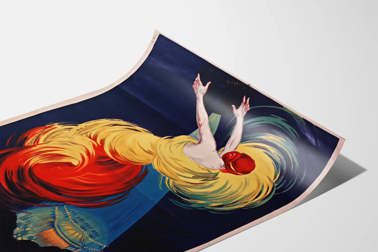 Discover this artistic poster depicting a dancer in dynamic motion, capturing the energy and fluidity of a stage performance. This wall decoration highlights curves and swirls of bright colors, dominated by vibrant yellow and red shades that contrast with a deep blue background. The dancer's posture, with arms raised upward and head turned, conveys a sense of momentum and grace, evoking the intensity of a show under the spotlight. The background hints at an illuminated venue, perhaps a theater or performance hall, enhancing the festive and artistic atmosphere of the composition. This poster, with its retro touch and distinctive graphic style, is a perfect choice for an original and lively wall decoration. It will add character to a living room, a dance studio, or any space dedicated to art and culture. The contrast of colors and the dynamism of the design make this poster a remarkable decorative element, ideal for dressing a wall with a touch of elegance and movement. This poster is suitable for all lovers of graphic art, dance, and visual performances, seeking to incorporate an expressive piece into their interior. In short, this Moscow Dance poster is an invitation to emotion and movement, a true modern painting to enhance your wall decoration.