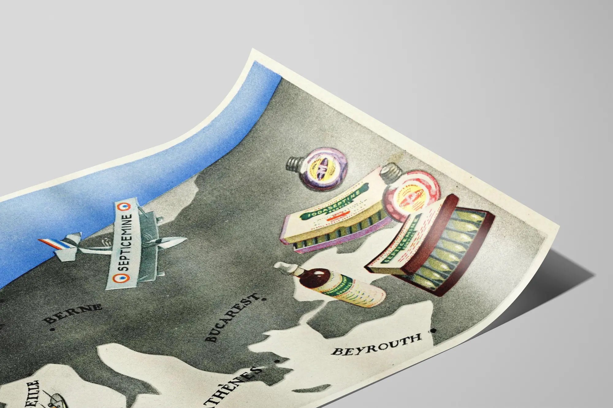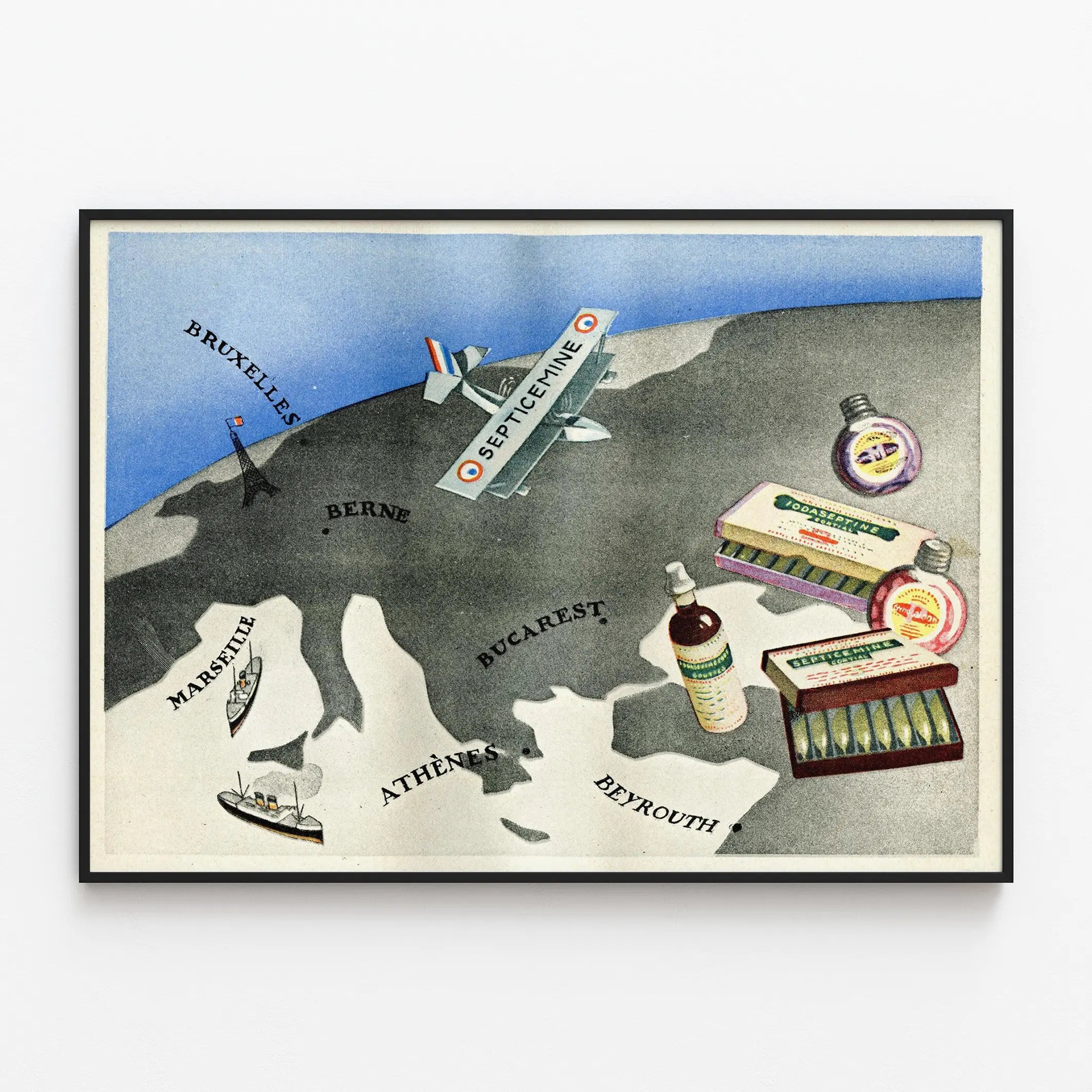 Add a retro and original touch to your wall decor with this vintage advertising poster featuring the Septicemine brand. This poster depicts a stylized map of Europe and the Middle East, highlighting several iconic cities such as Brussels, Bern, Bucharest, Marseille, Athens, and Beirut. At the center, a biplane bearing the name SEPTICEMINE on its wings soars over the map, symbolizing the brand's international reach. To the right of this illustration, various products from Septicemine are displayed, including bottles, box of bulbs, and colorful packaging typical of vintage advertisements. This vintage advertising artwork is a unique decorative piece that will seamlessly fit into an industrial, vintage, or even modern interior seeking to create a striking contrast. Its nostalgic design brings an atmospheric touch of the past and celebrates the history of advertising. Every detail of this wall poster captures attention, from the antique typography to the delicately colored illustrations on a light background. Using this poster as wall decor in a living room, waiting area, or office adds an aesthetic and historical dimension. It also makes an excellent choice for enthusiasts of vintage graphic design or to enrich a collection of old posters. This promotional visual creates a warm and personalized ambiance in your space, telling a story through its visual elements. In terms of wall decoration, this advertising poster stands out for its originality and evocation of an industrial and commercial past. Choosing this Septicemine poster means opting for a decorative object that is both artistic and rich in visual memory, perfect for enhancing your walls with authenticity and style.